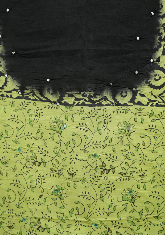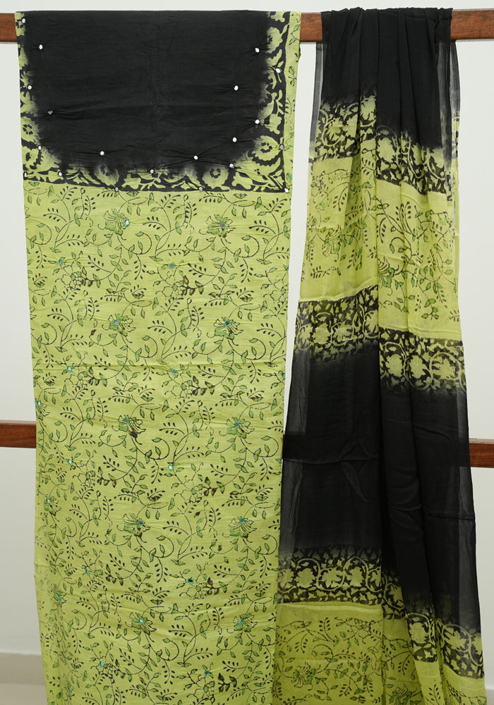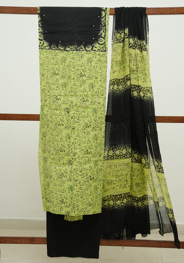 Light Green and Black Unstitched Cotton Salwar Set With Mirror Work
