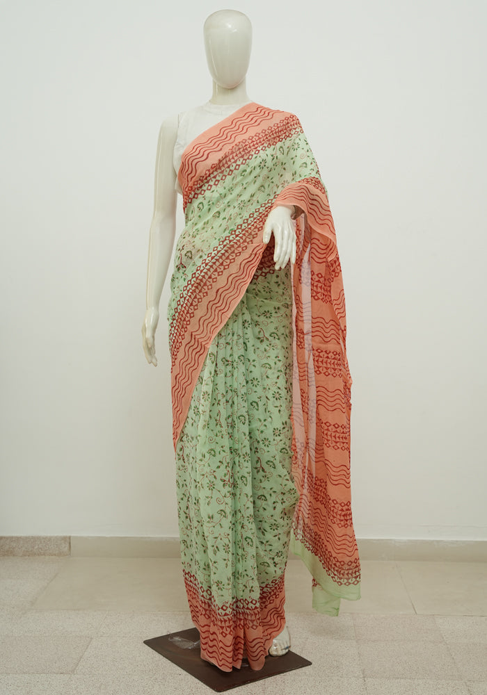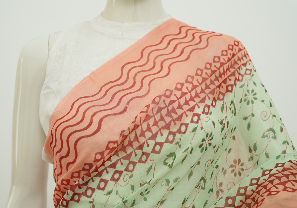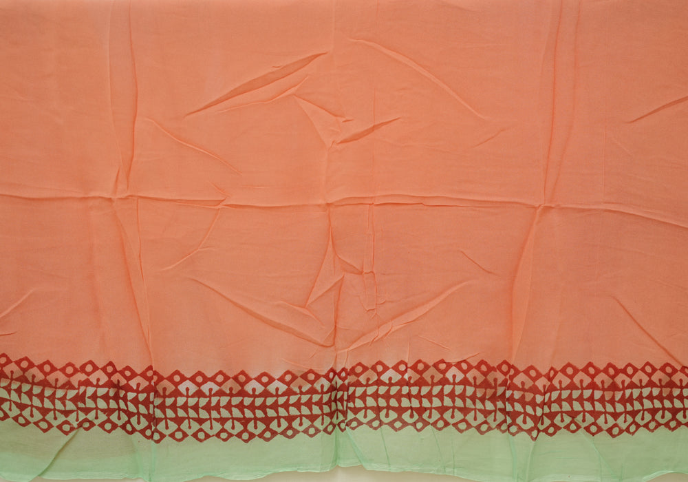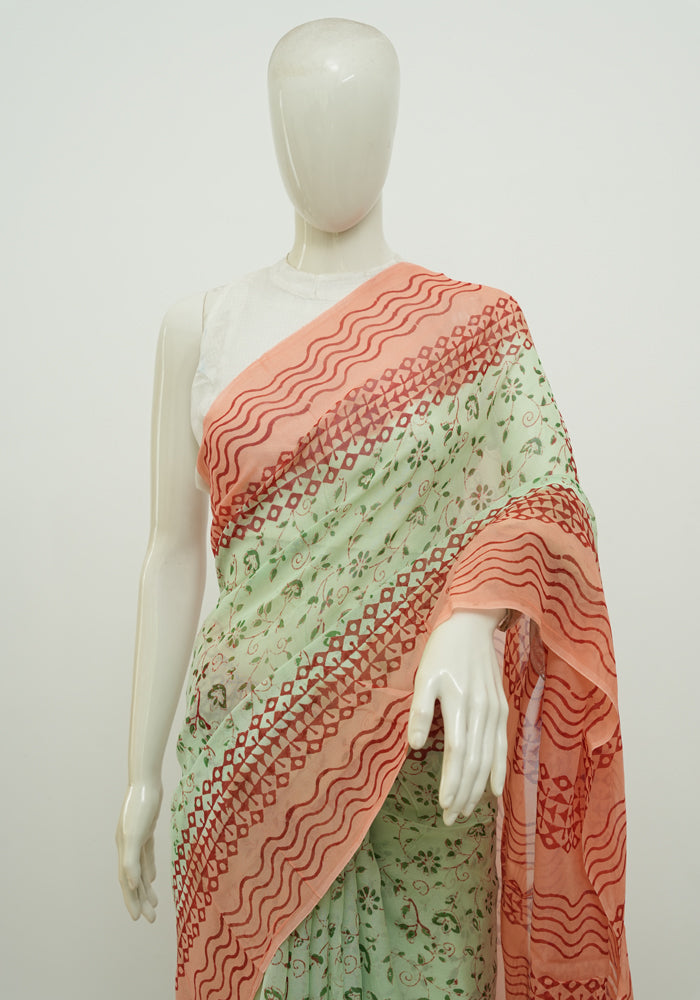 Light Green and Peach Block Printed Georgette Saree is OUT OF STOCK currently and available on pre-payment only. Order now for delivery within 2 weeks.