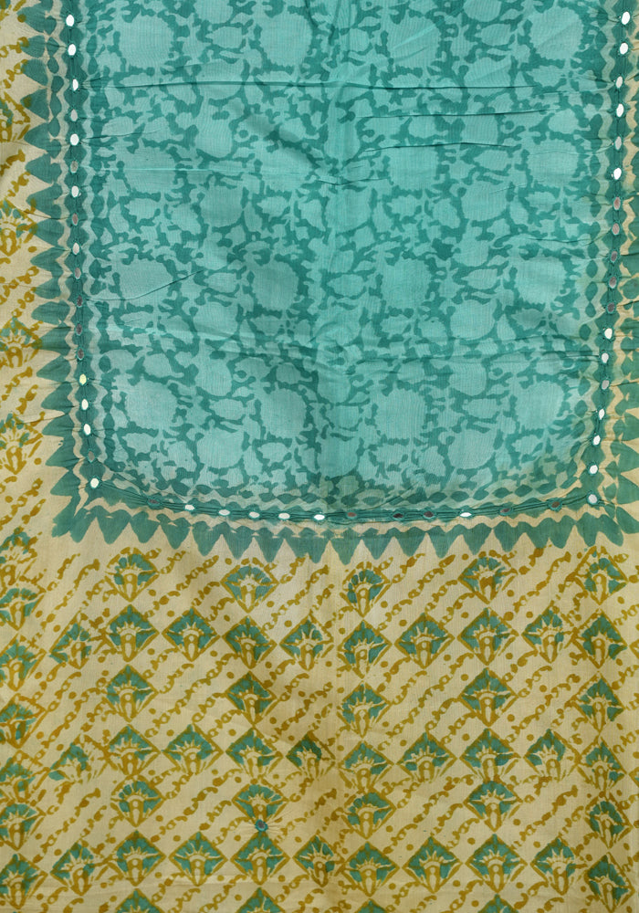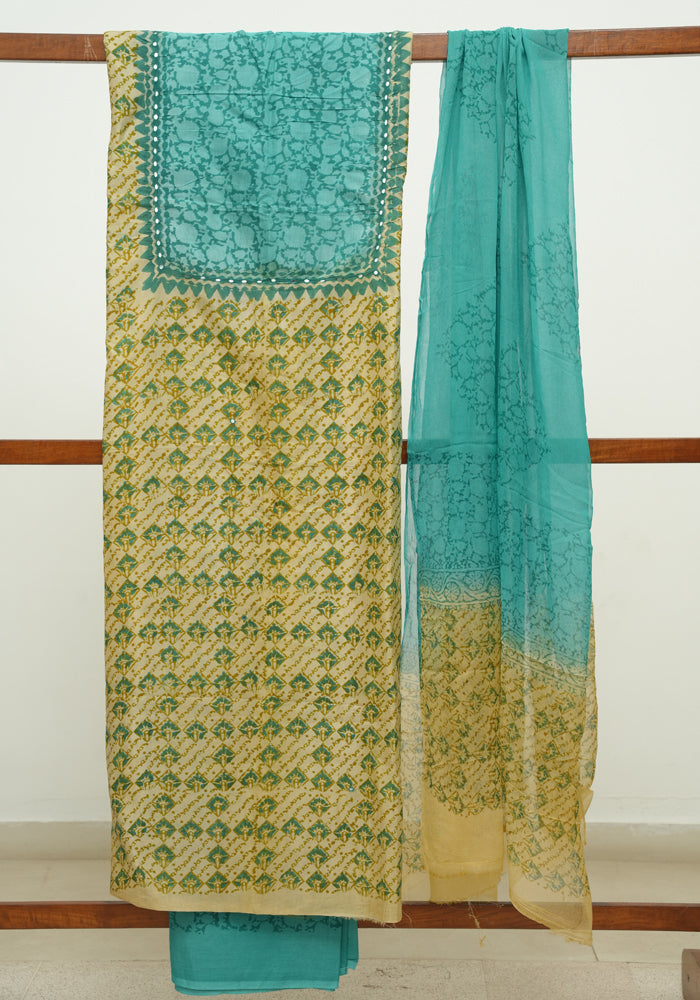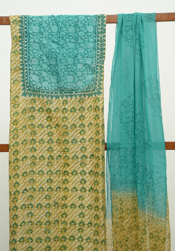 Light Green and Teal Green Unstitched Chennur Silk Salwar Set With Mirror Work