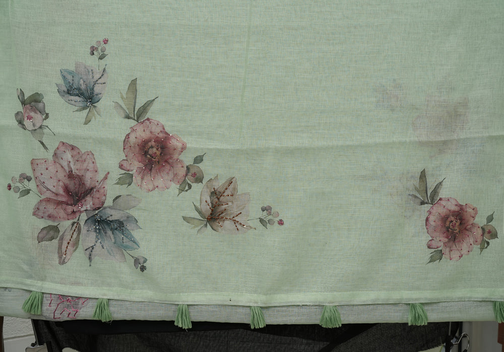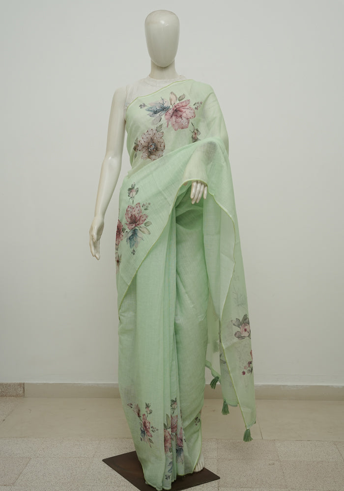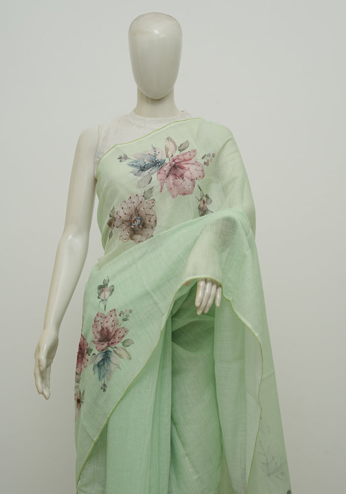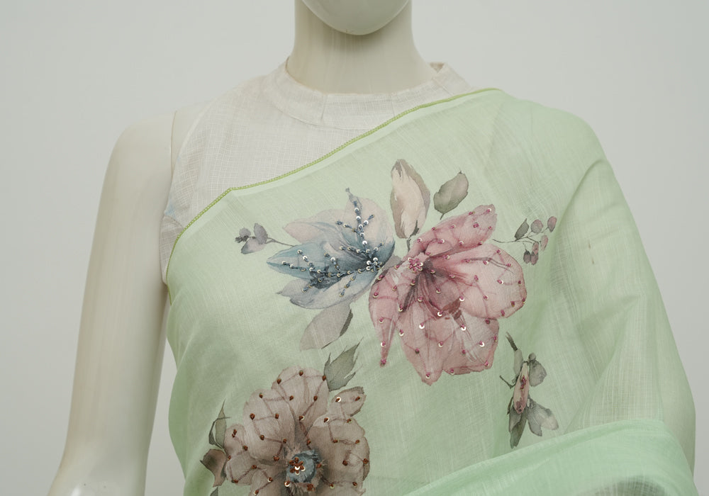 Light Green Semi Linen Saree with Digital Print and Sequence Work is OUT OF STOCK currently and available on pre-payment only. Order now for delivery within 2 weeks.