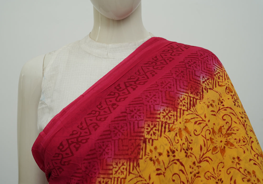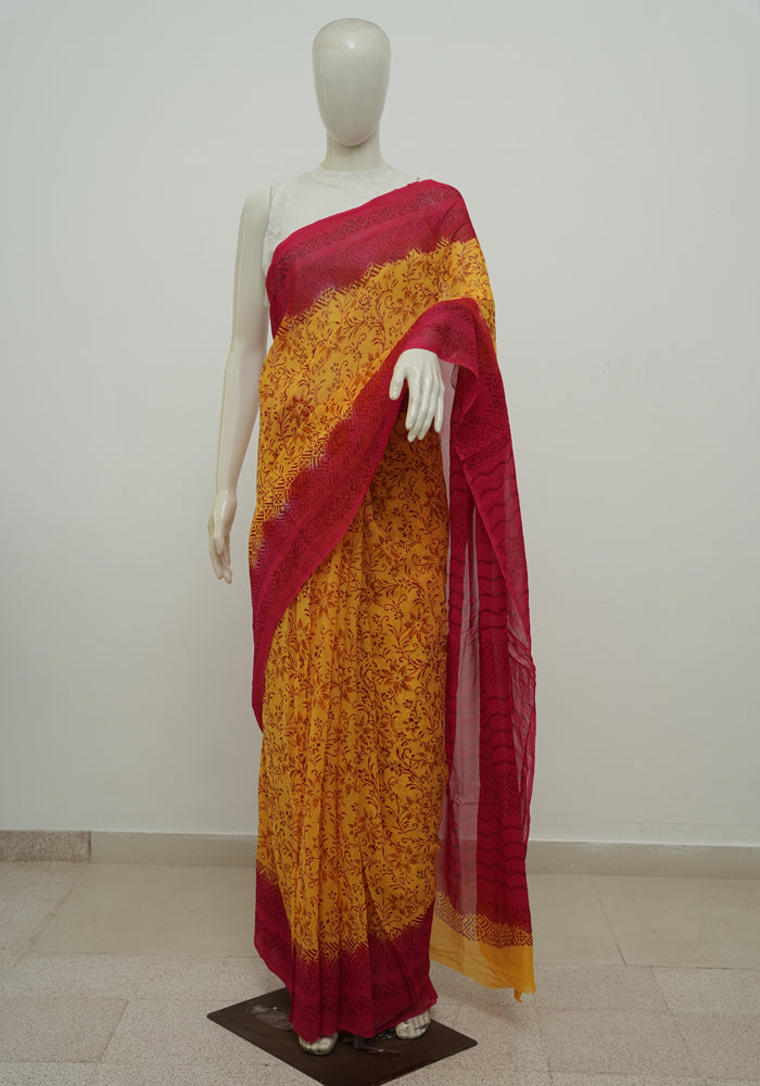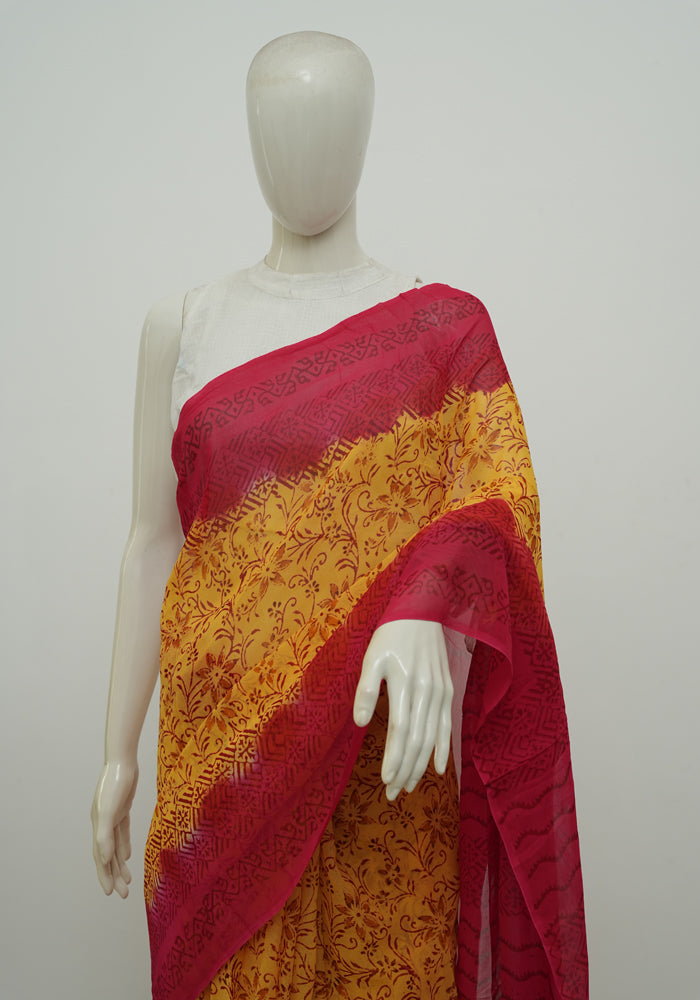 Mango Yellow and Red Block Printed Georgette Saree is OUT OF STOCK currently and available on pre-payment only. Order now for delivery within 2 weeks.