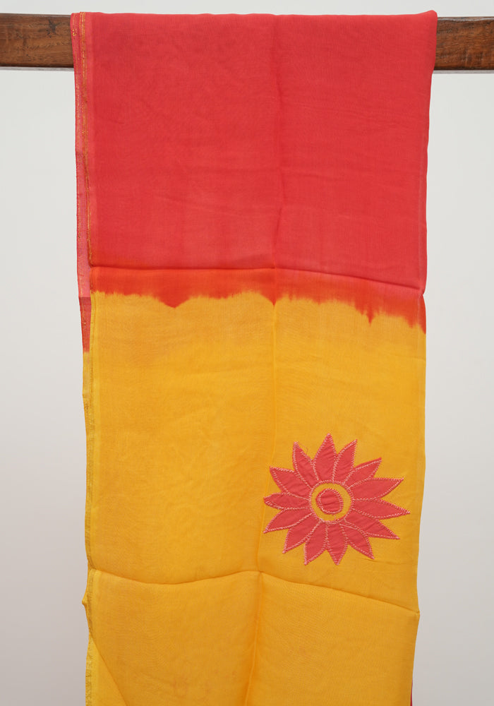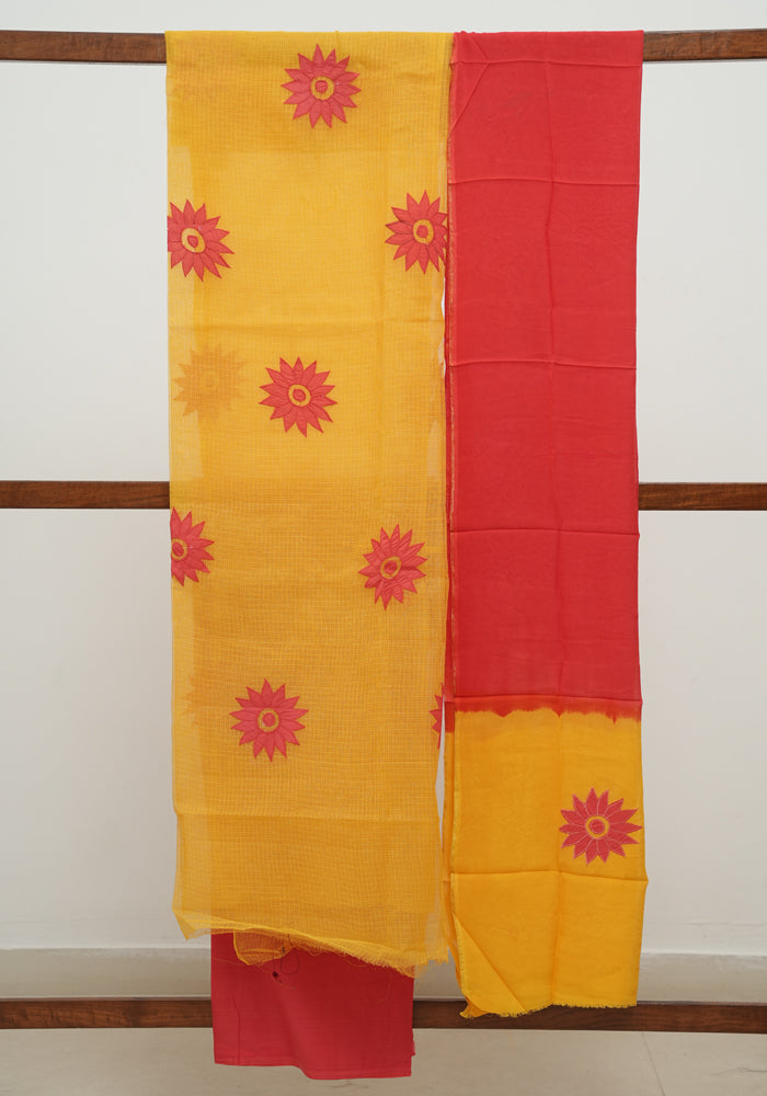 Mango Yellow and Red Unstitched Applique Work Kota Salwar Set With Silk Dupatta