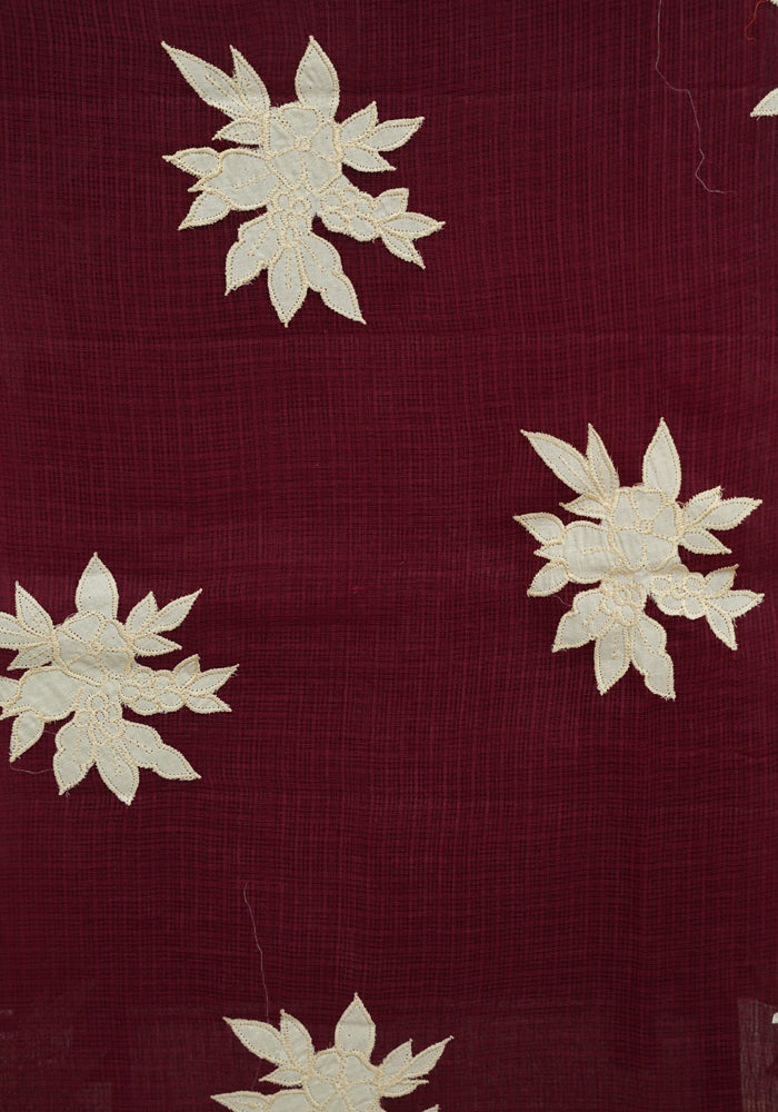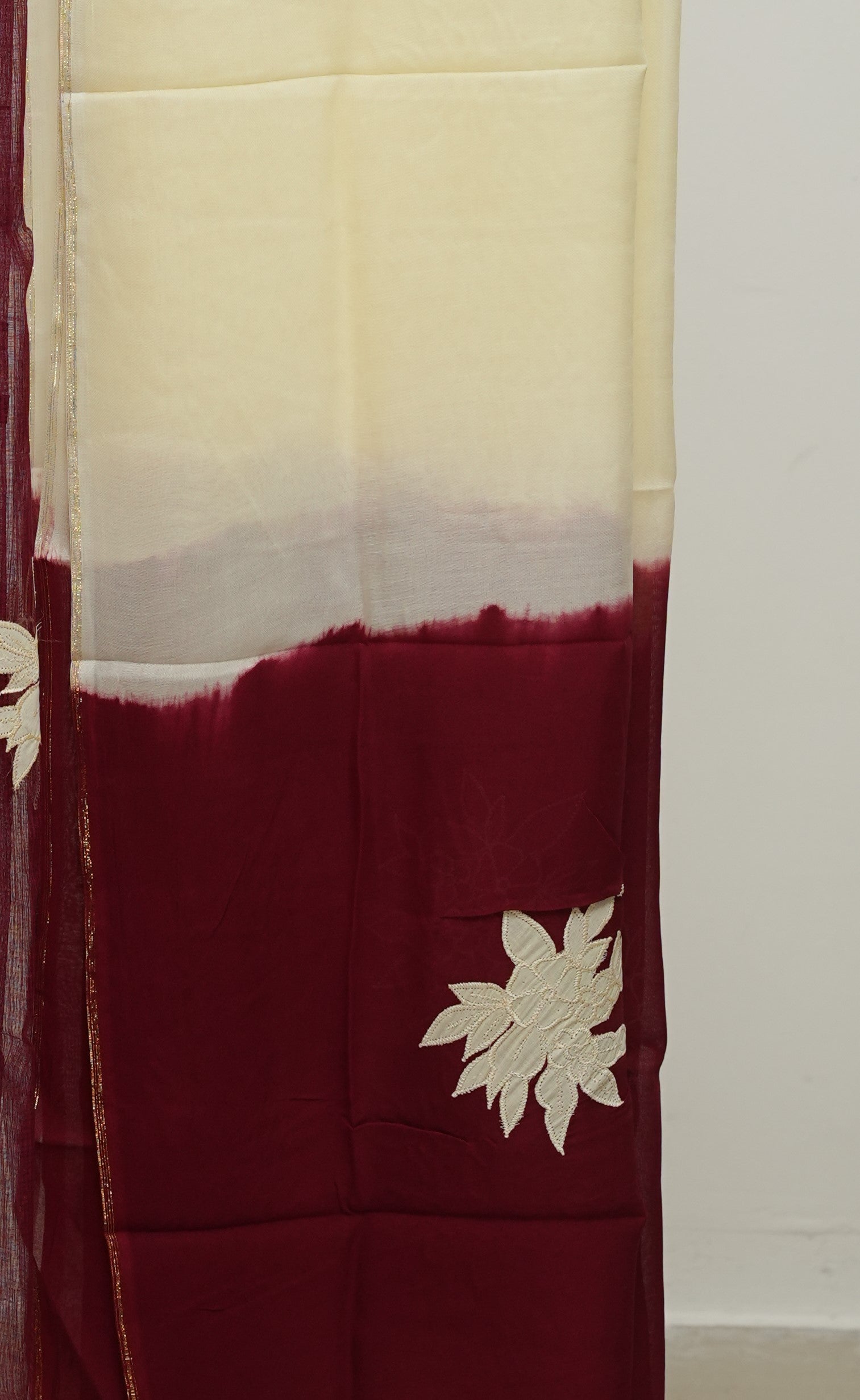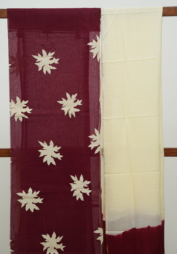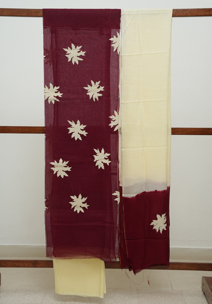 Maroon and Light Yellow Unstitched Applique Work Kota Salwar Set With Silk Dupatta