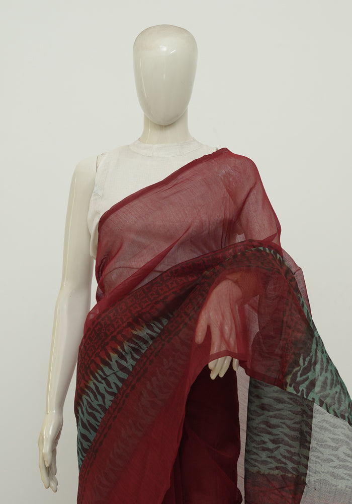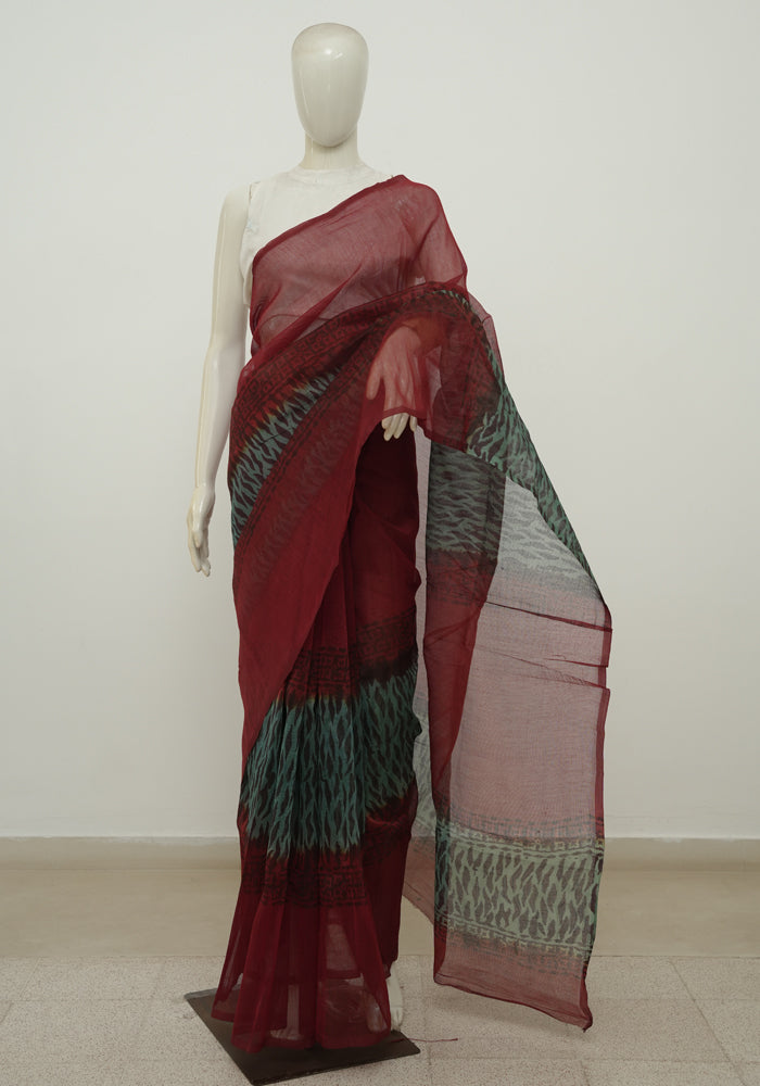 Maroon and Teal Green Block printed Supernet Kota Saree