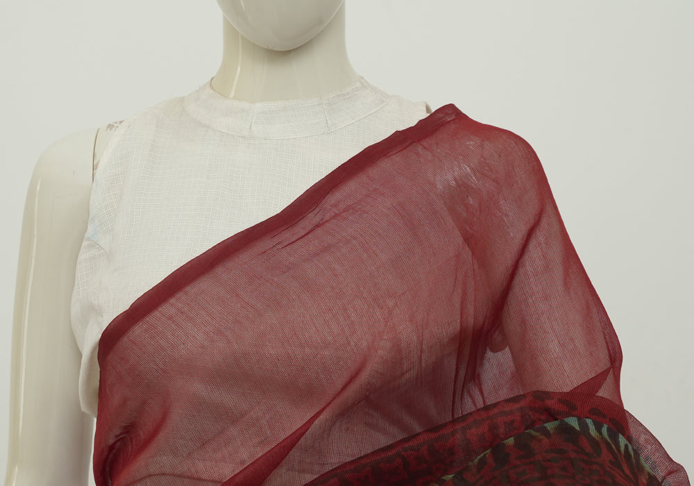 Maroon and Teal Green Block printed Supernet Kota Saree is OUT OF STOCK currently and available on pre-payment only. Order now for delivery within 2 weeks.