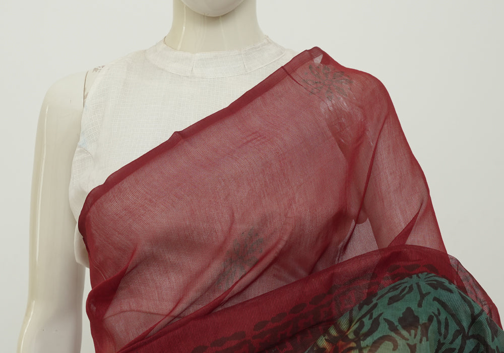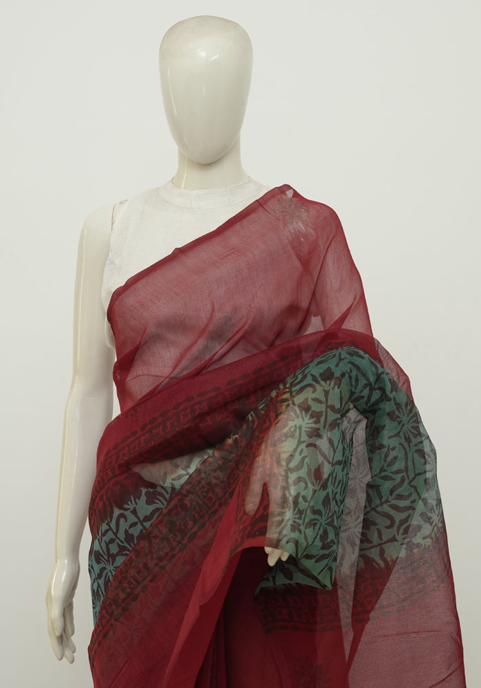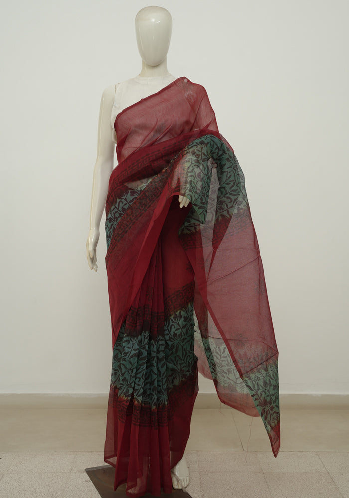 Maroon and Teal Green Block printed Supernet Kota Saree