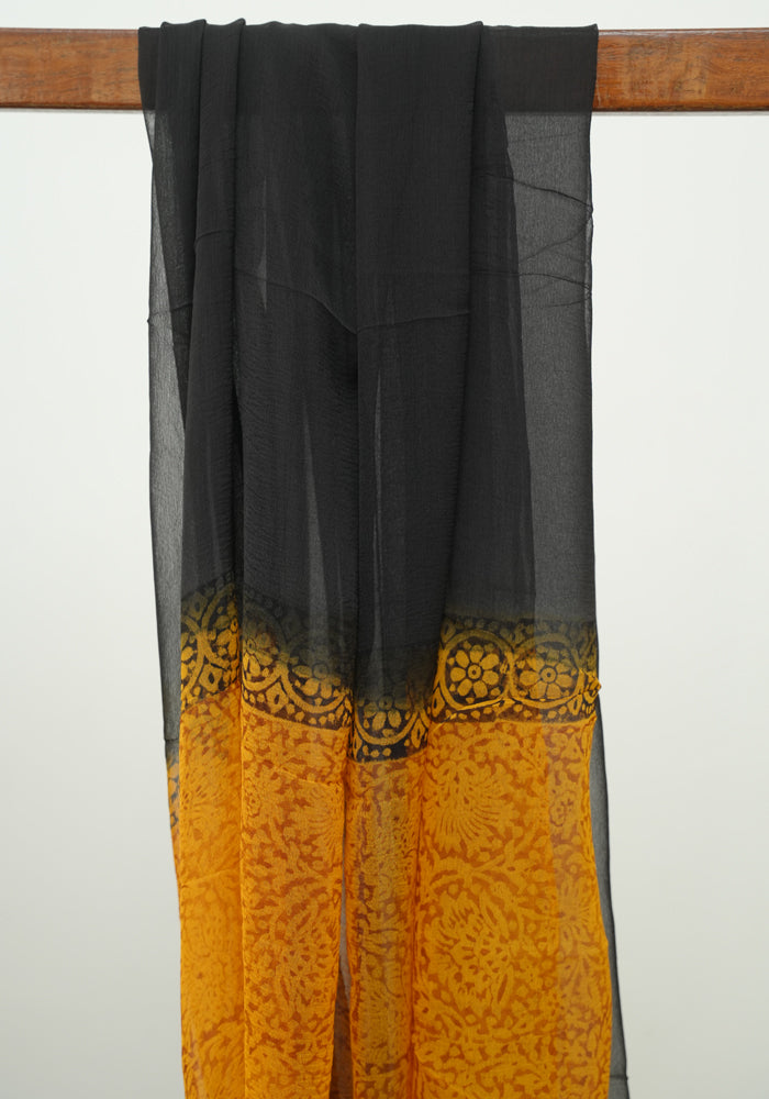 Mustard Yellow and Black Modal Silk Block Printed Unstitched Salwar Set is OUT OF STOCK currently and available on pre-payment only. Order now for delivery within 2 weeks.