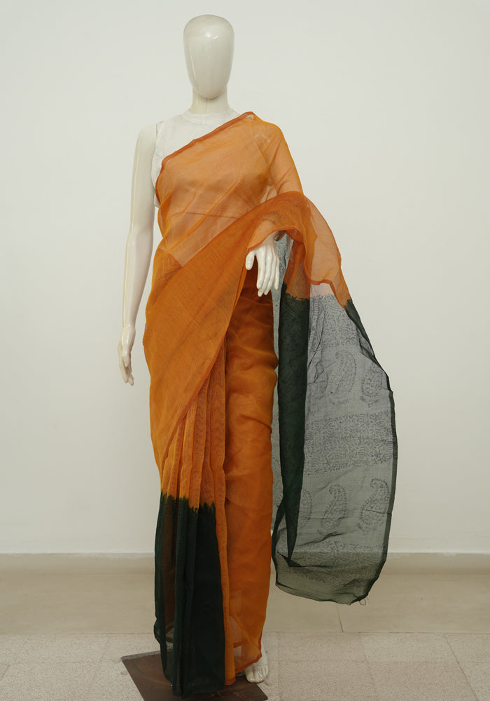 Mustard Yellow and Dark Green Block printed Supernet Kota Saree is OUT OF STOCK currently and available on pre-payment only. Order now for delivery within 2 weeks.