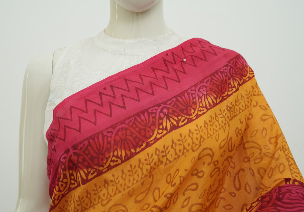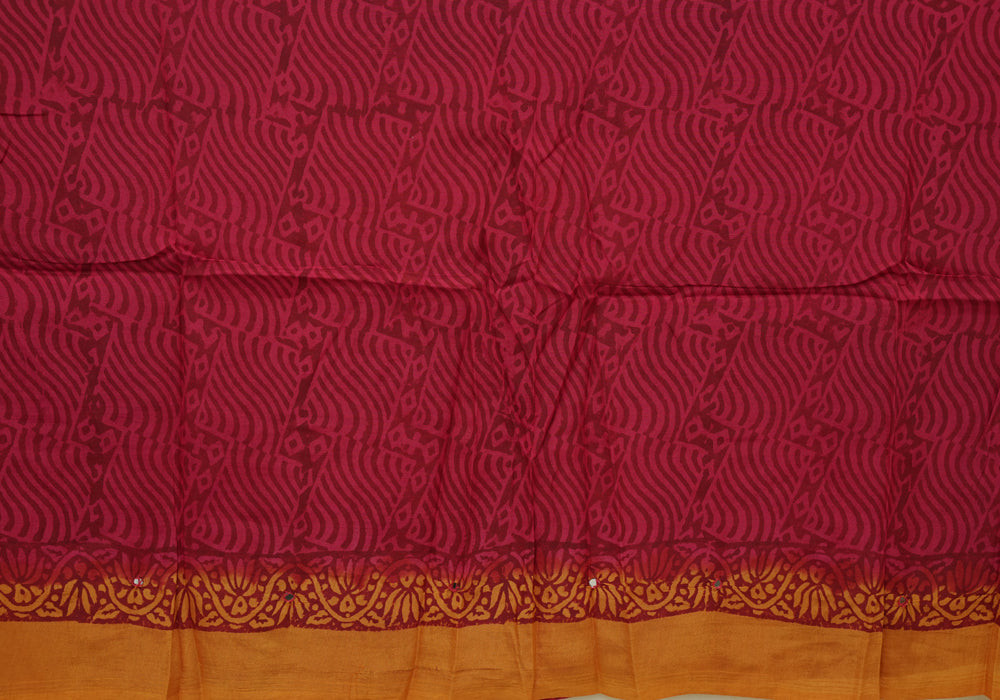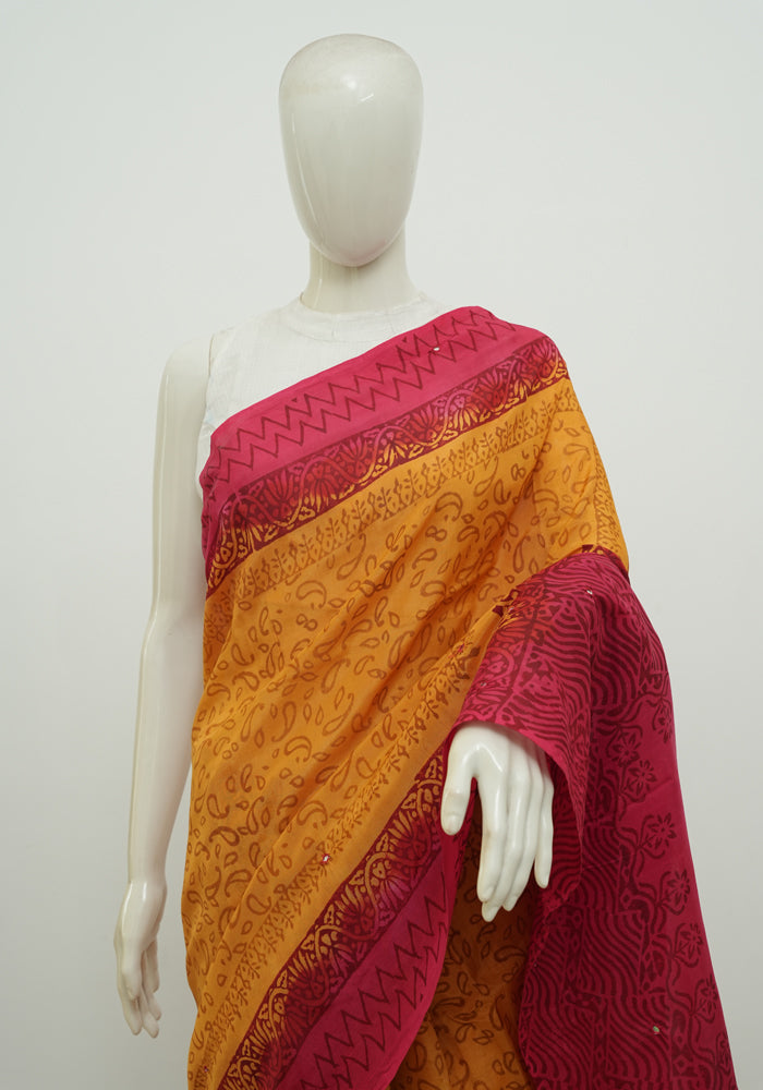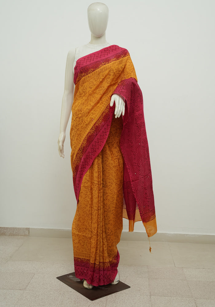 Mustard Yellow and Pinkish Red Block Printed Chennur Silk Saree with Mirror Work