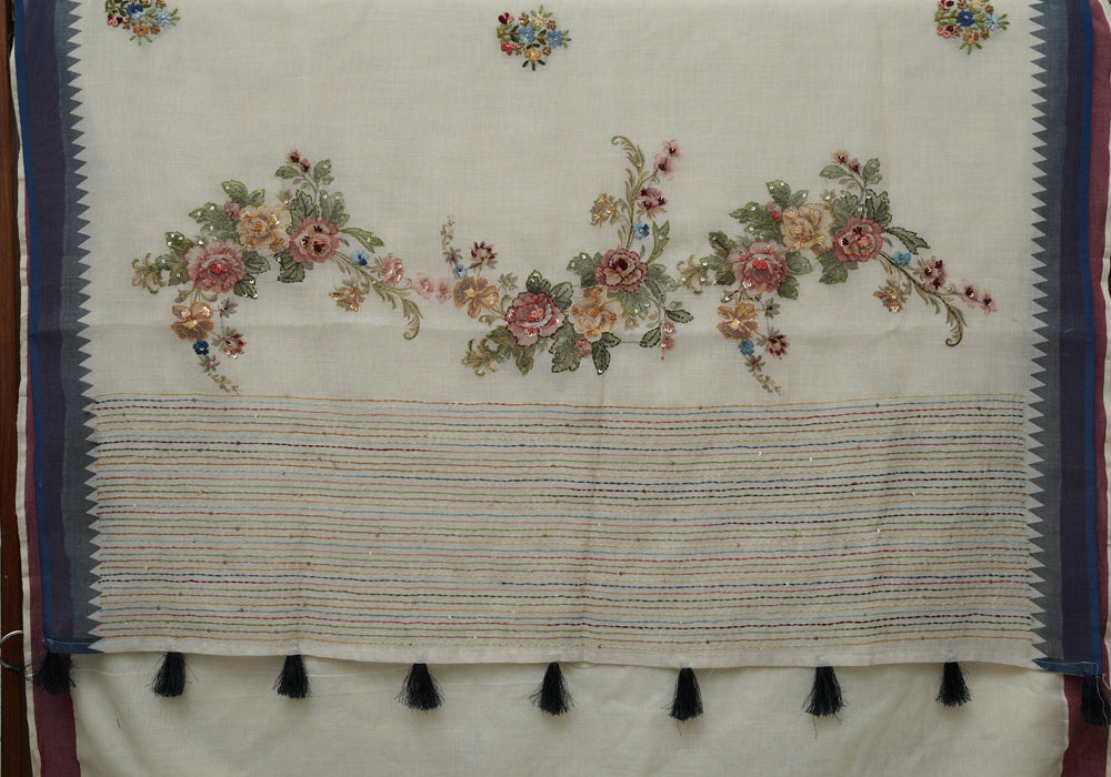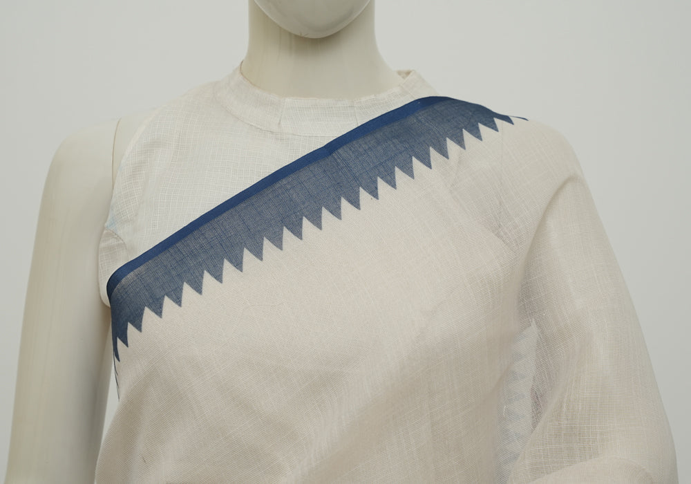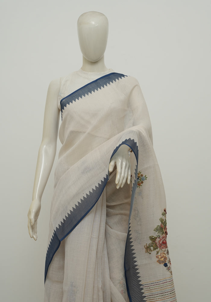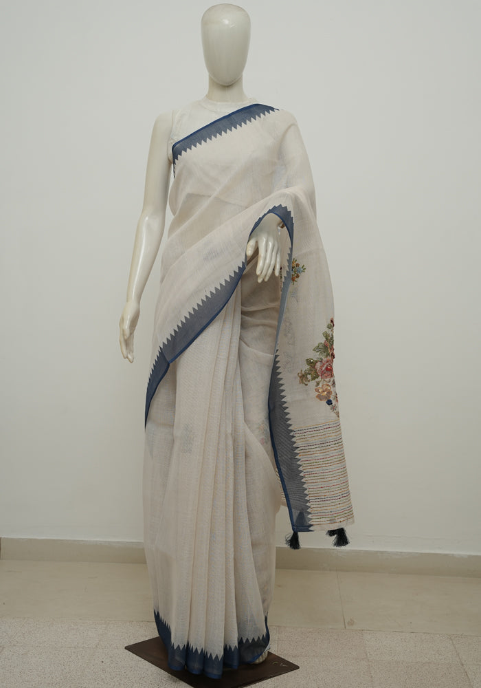 Off White and Blue Semi Linen Saree with Digital Print and Hand Embroidery is OUT OF STOCK currently and available on pre-payment only. Order now for delivery within 2 weeks.