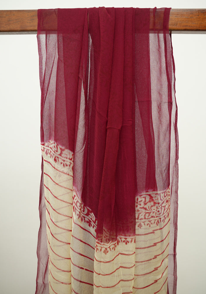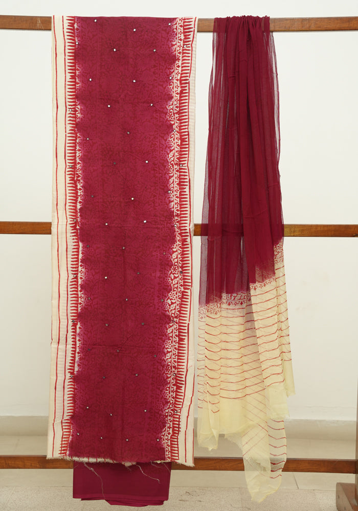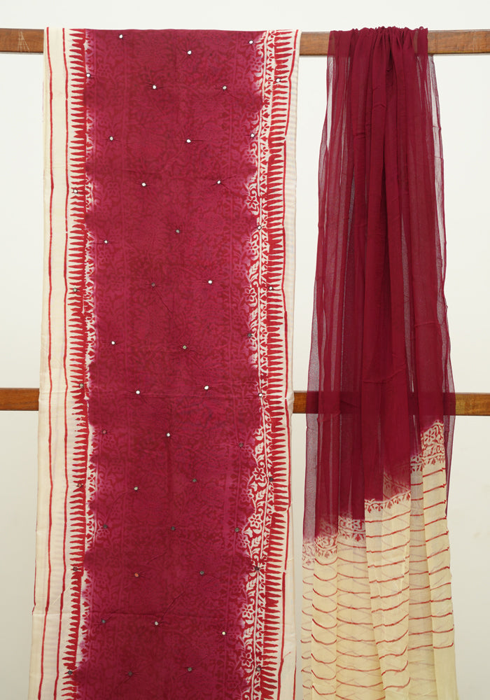 Off White and Maroon Unstitched Chennur Silk Salwar Set With Mirror Work
