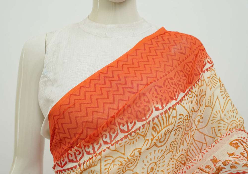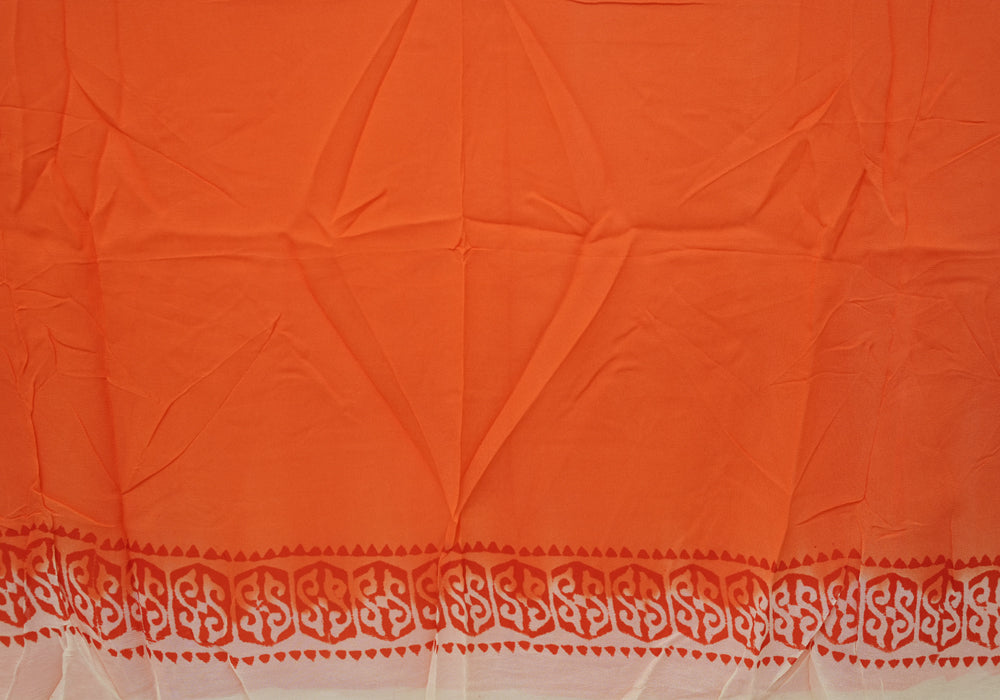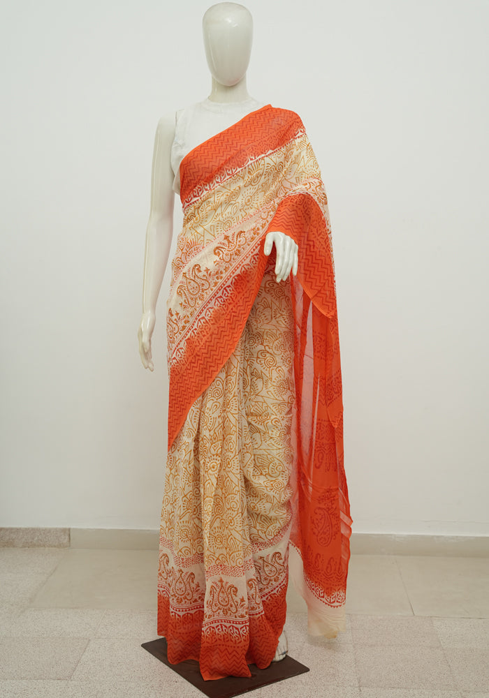 Off White and Orange Block Printed Georgette Saree is OUT OF STOCK currently and available on pre-payment only. Order now for delivery within 2 weeks.