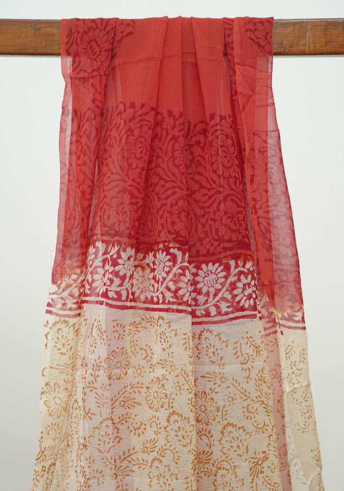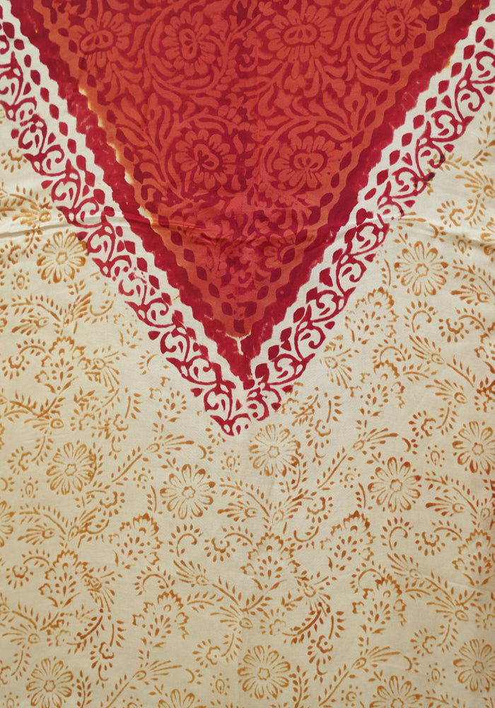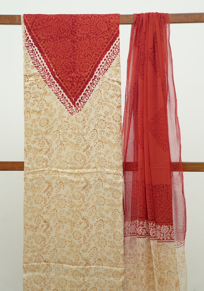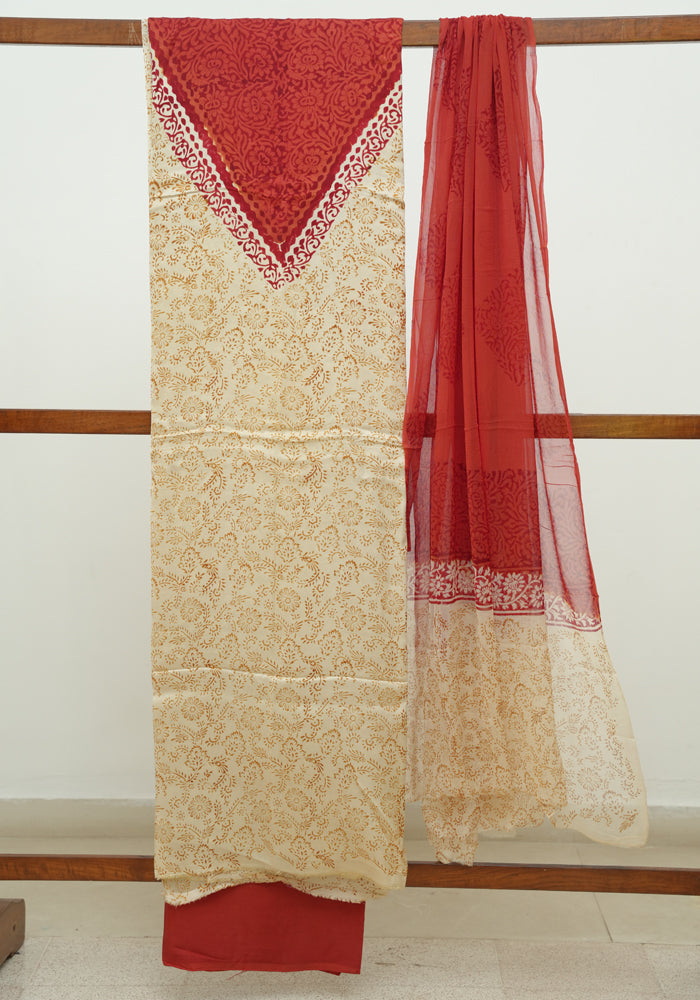 Off White and Rust Red Modal Silk Block Printed Unstitched Salwar Set