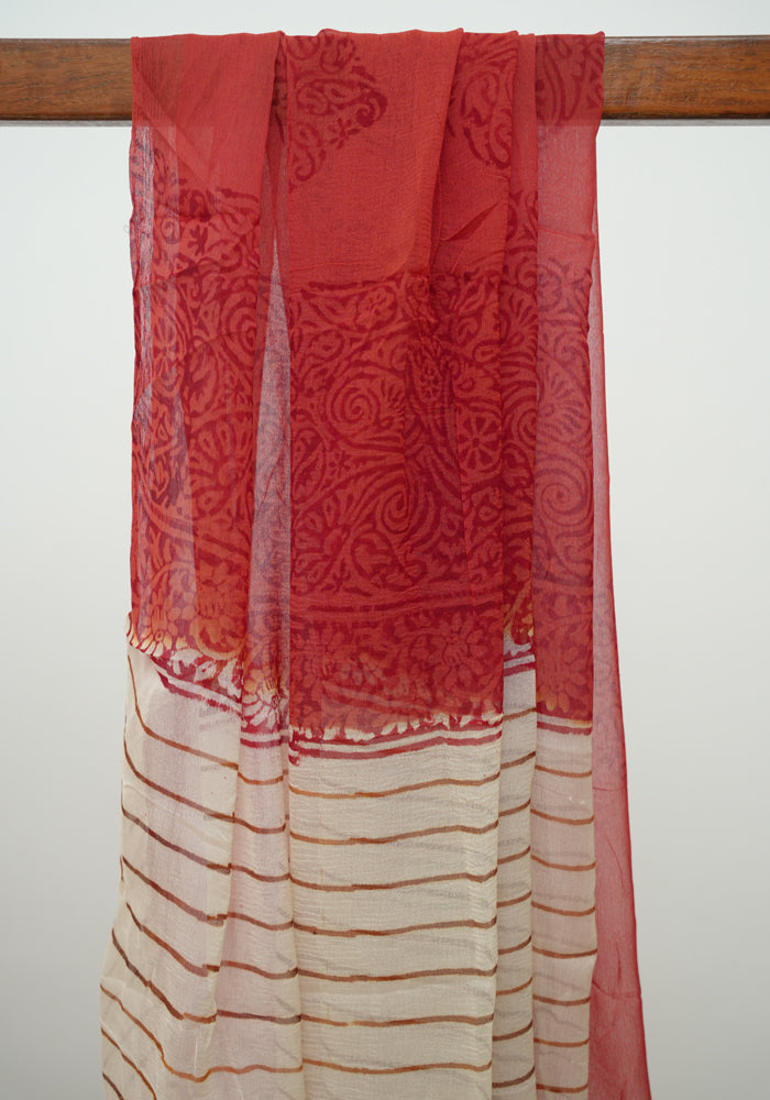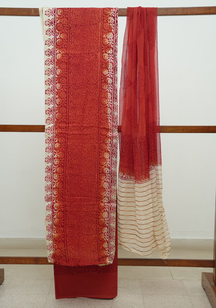 Off White and Rust Red Modal Silk Block Printed Unstitched Salwar Set