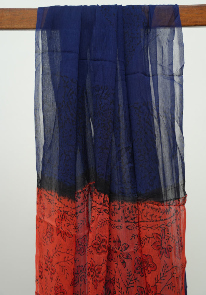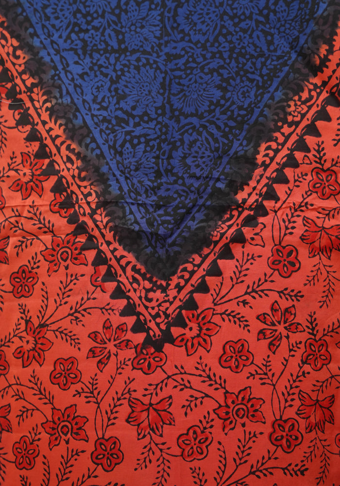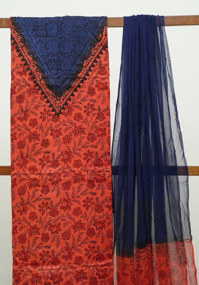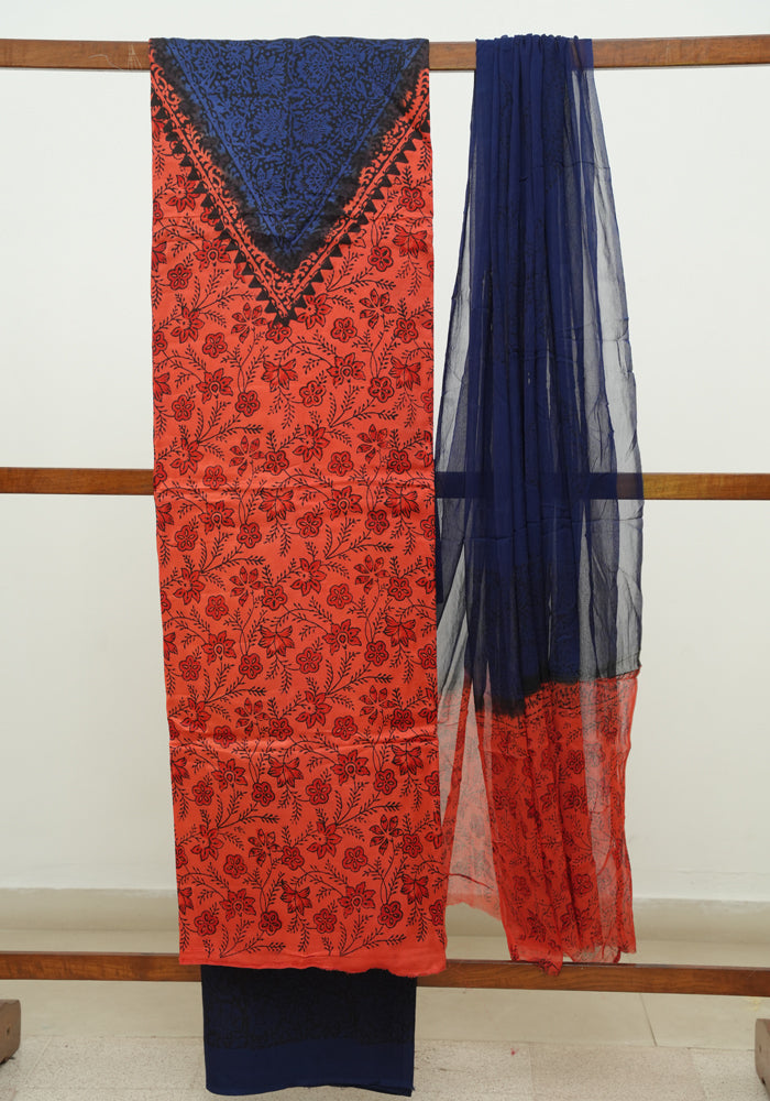 Orange and Blue Modal Silk Block Printed Unstitched Salwar Set