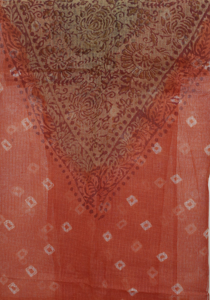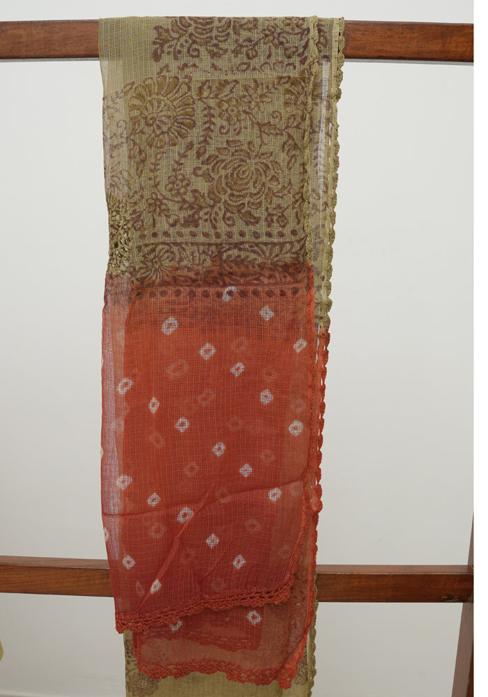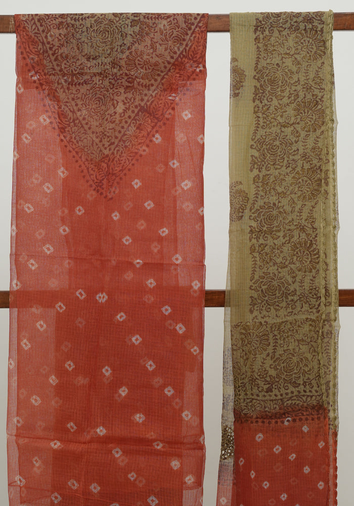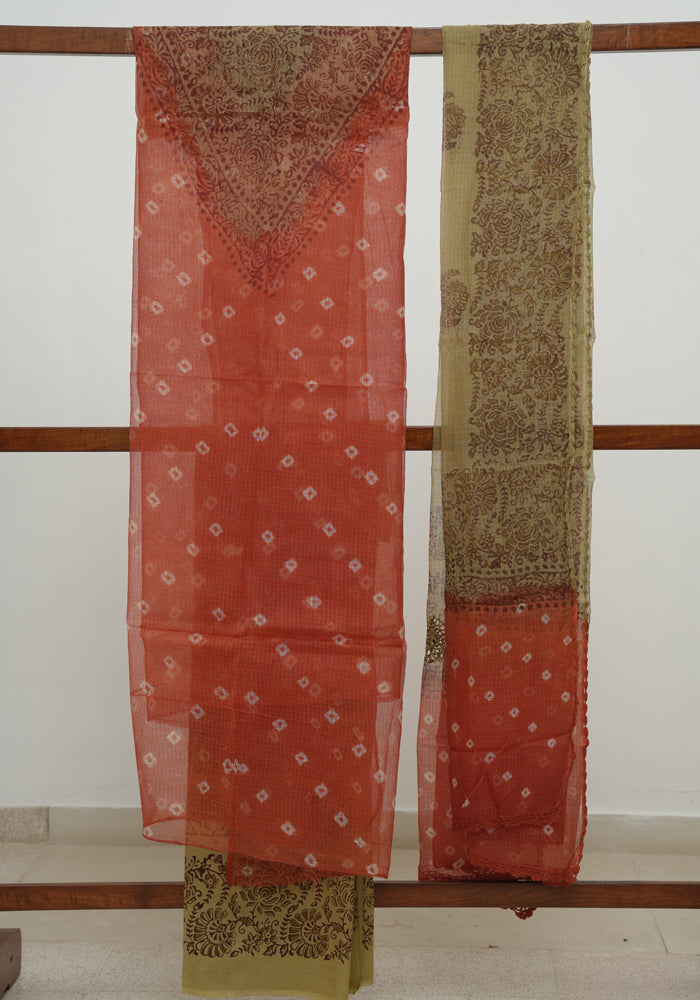 Orange and Olive Green Unstitched Block Printed Kota Salwar Set With Bandini and Crochet Dupatta