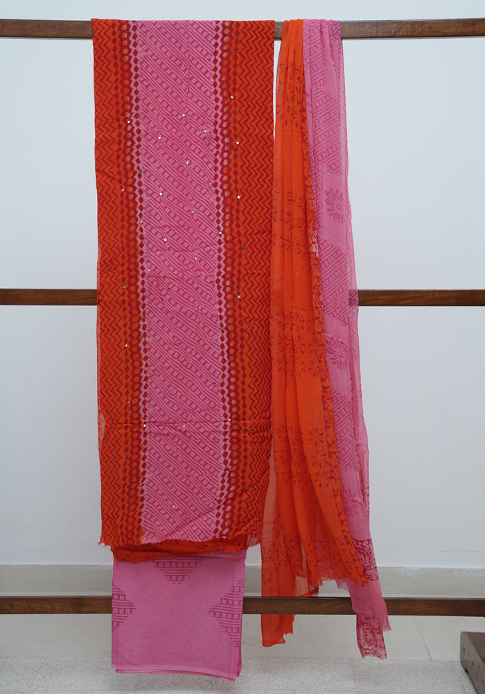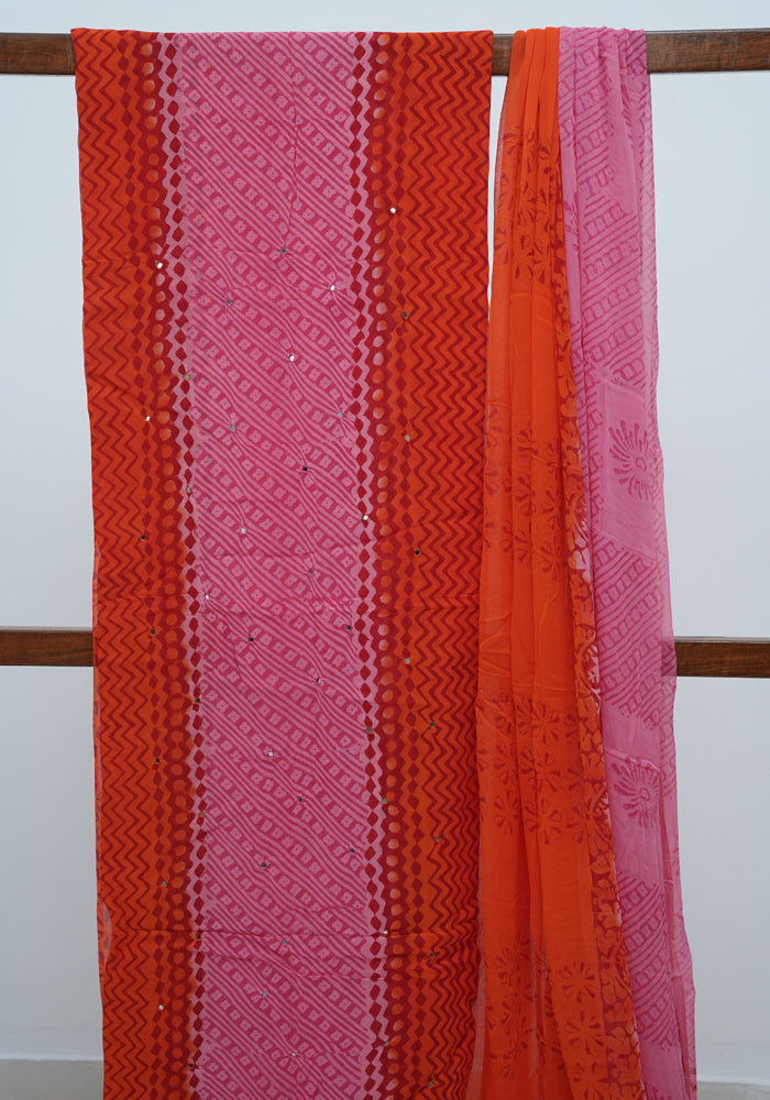 Orange and Pink Unstitched Georgette Salwar Set with Mirror Work