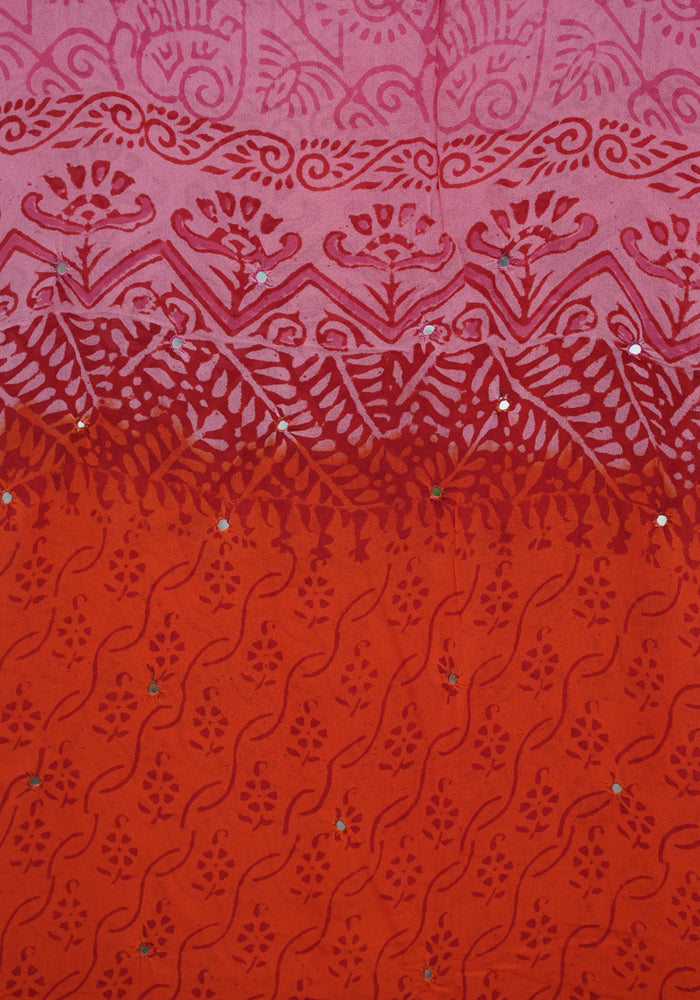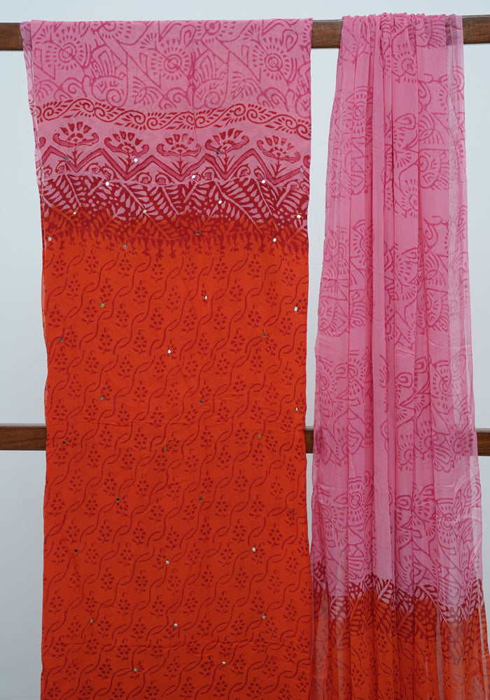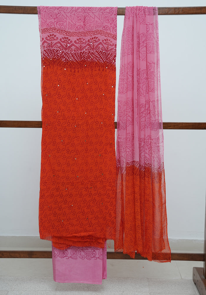 Orange and Pink Unstitched Georgette Salwar Set with Mirror Work is OUT OF STOCK currently and available on pre-payment only. Order now for delivery within 2 weeks.