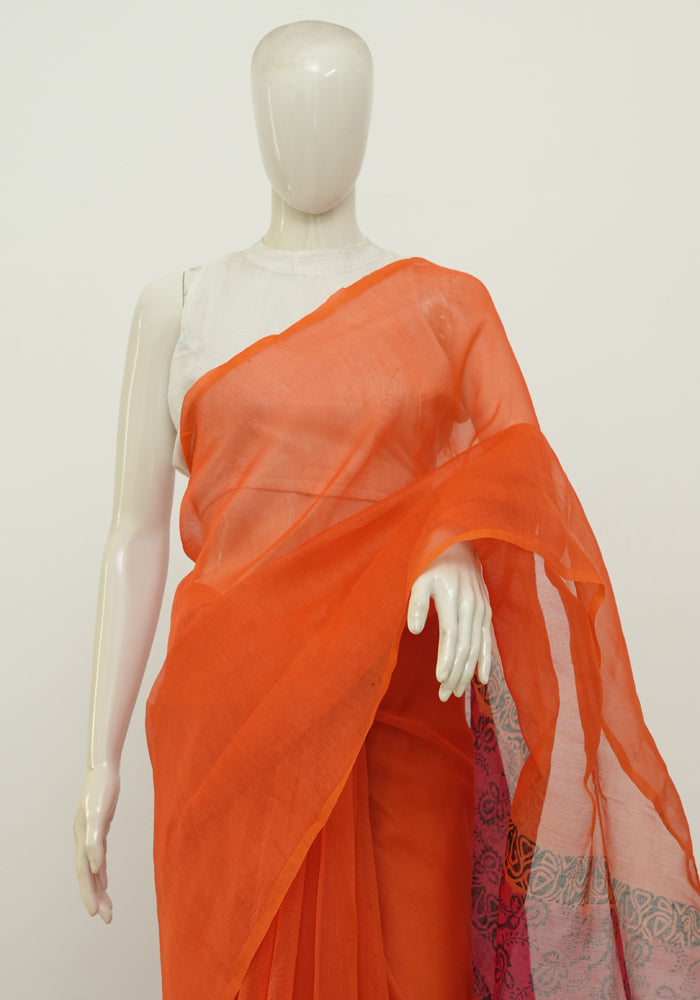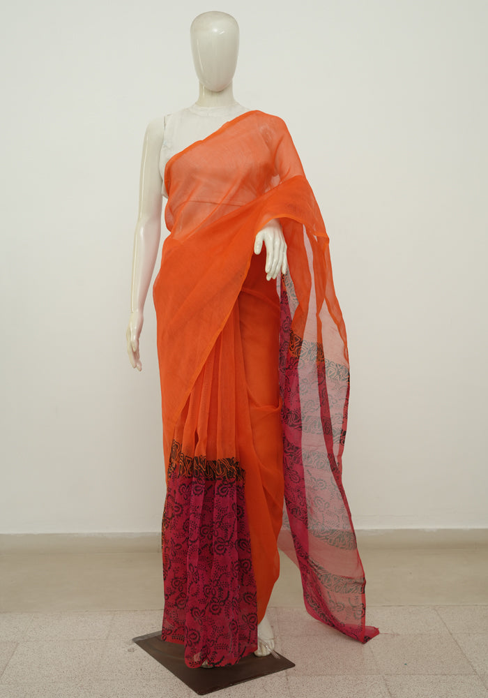 Orange and Pinkish Red Block printed Supernet Kota Saree