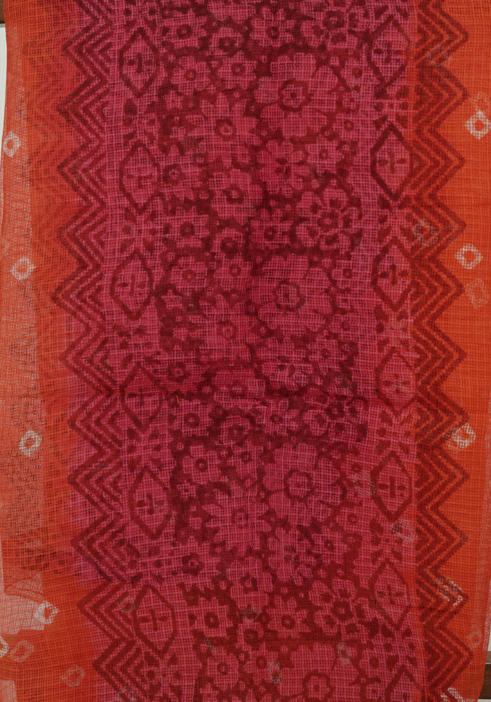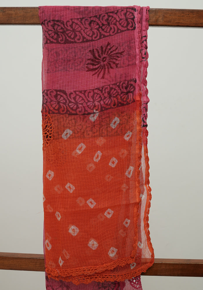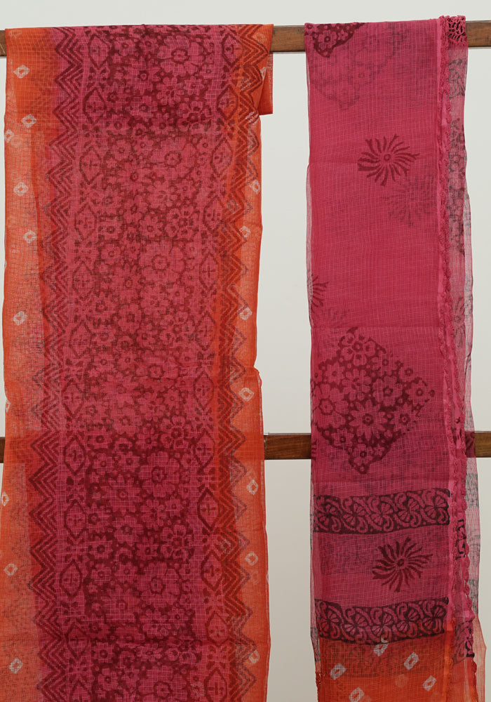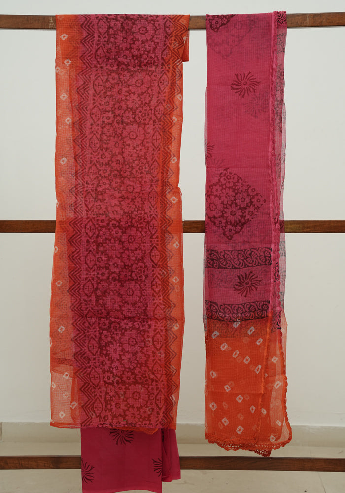 Orange and Pinkish Red Unstitched Block Printed Kota Salwar Set With Bandini and Crochet Dupatta