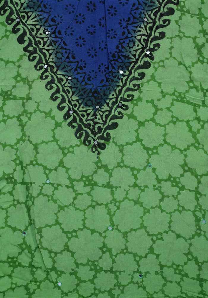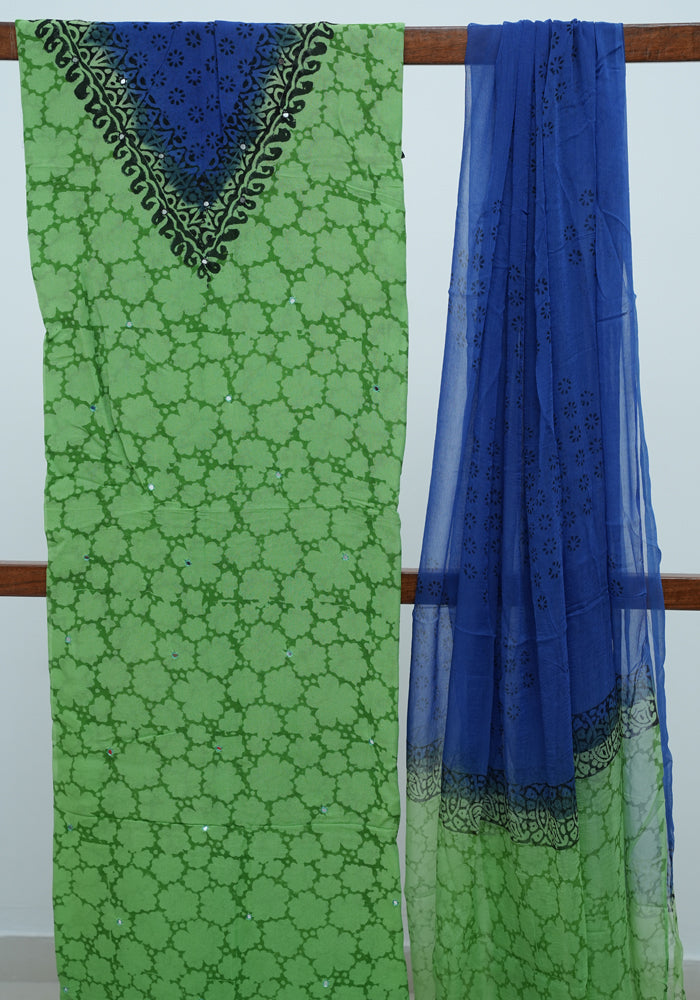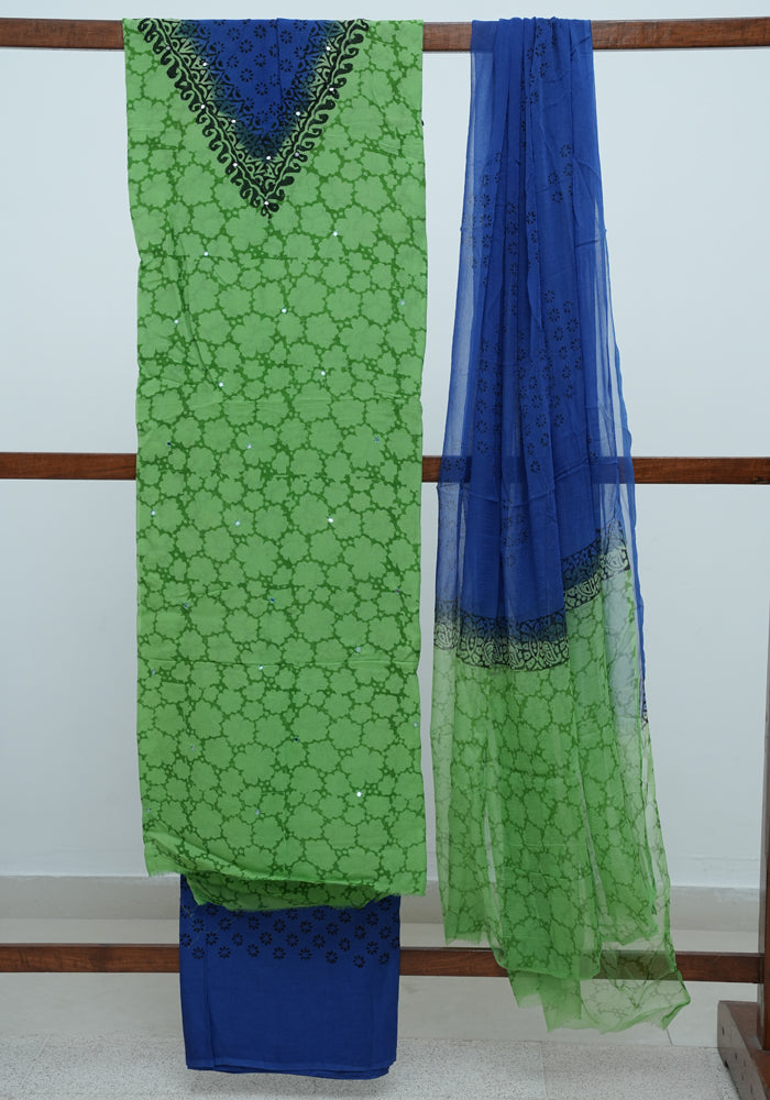Parrot Green and Blue Unstitched Georgette Salwar Set with Mirror Work is OUT OF STOCK currently and available on pre-payment only. Order now for delivery within 2 weeks.