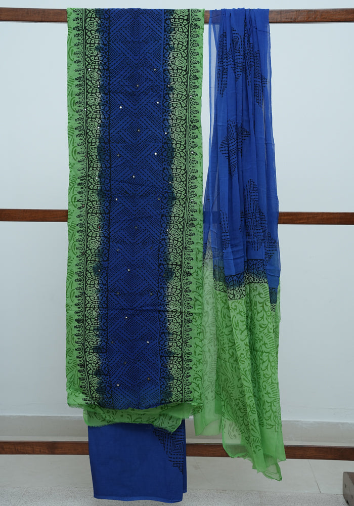 Parrot Green and Blue Unstitched Georgette Salwar Set with Mirror Work