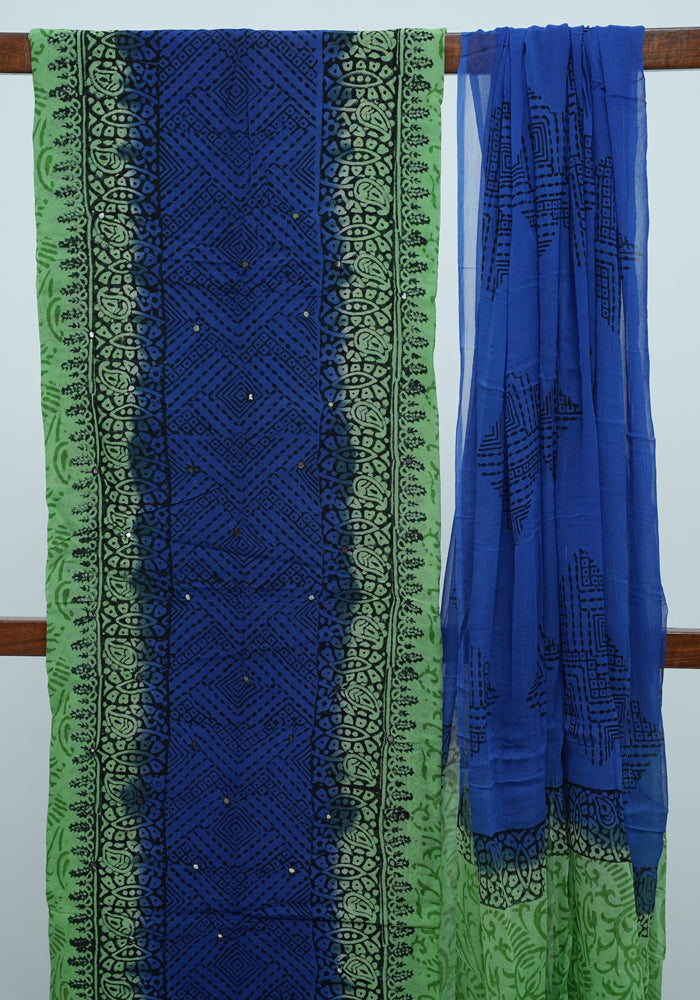 Parrot Green and Blue Unstitched Georgette Salwar Set with Mirror Work is OUT OF STOCK currently and available on pre-payment only. Order now for delivery within 2 weeks.