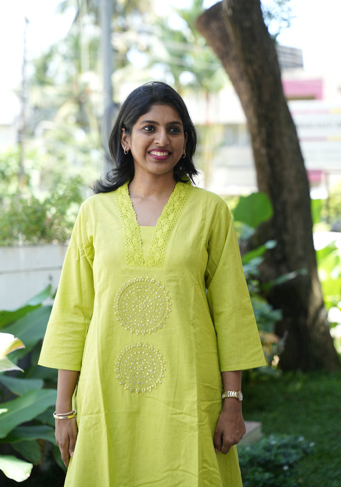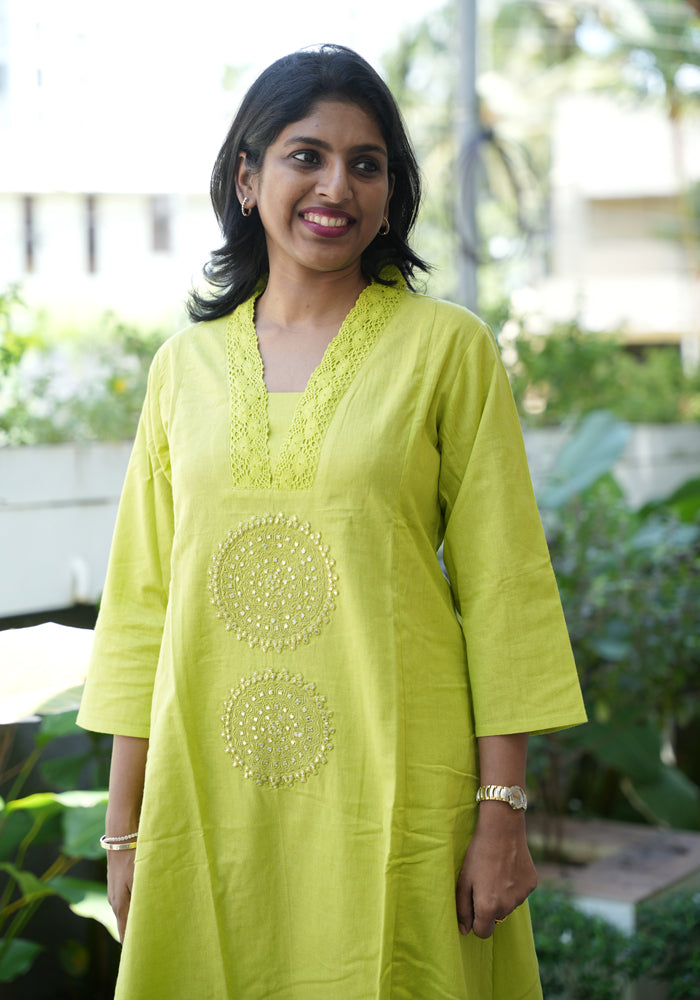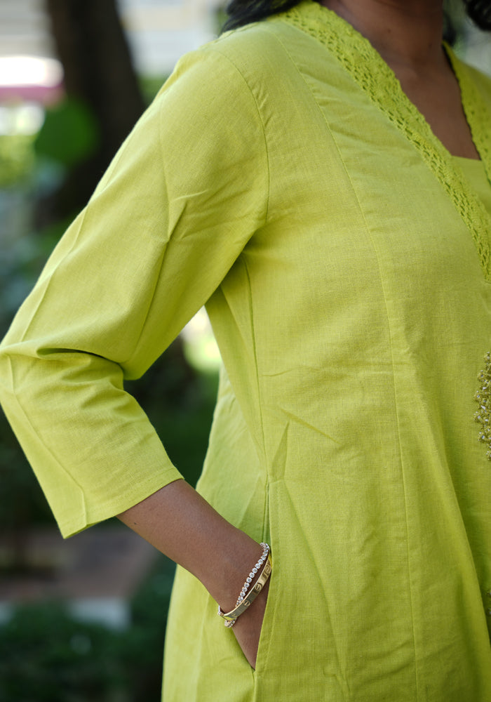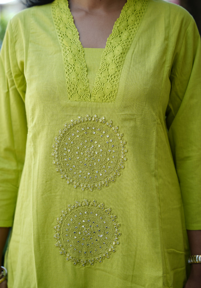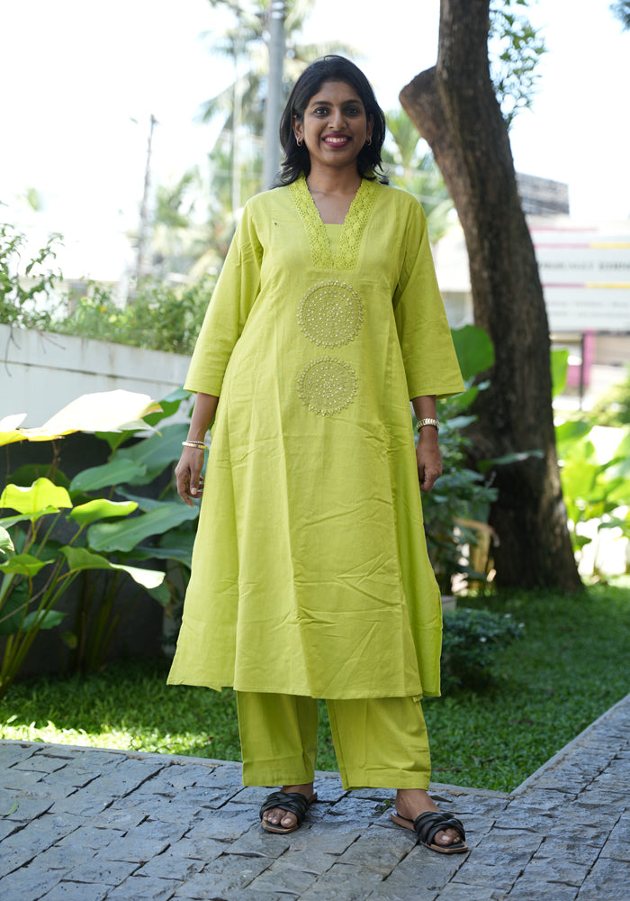 This pure cotton embroidered co-ord set is perfect for everyday wear. The top has embroidery and three fourth sleeves and the bottom is plain.
