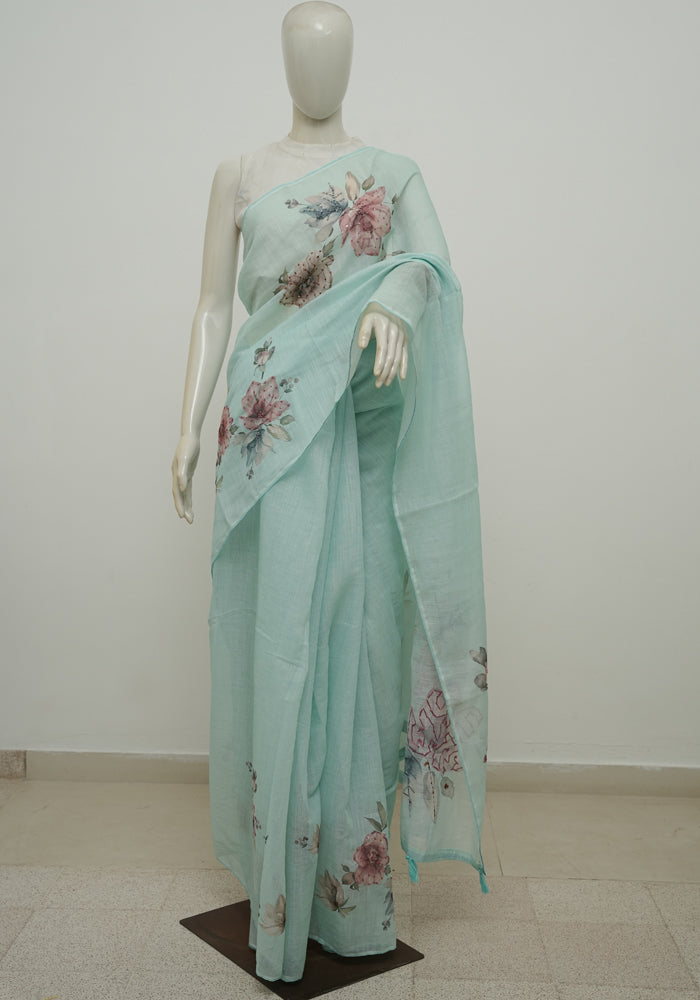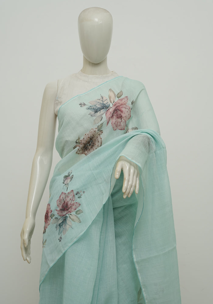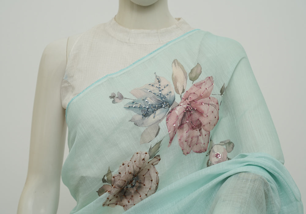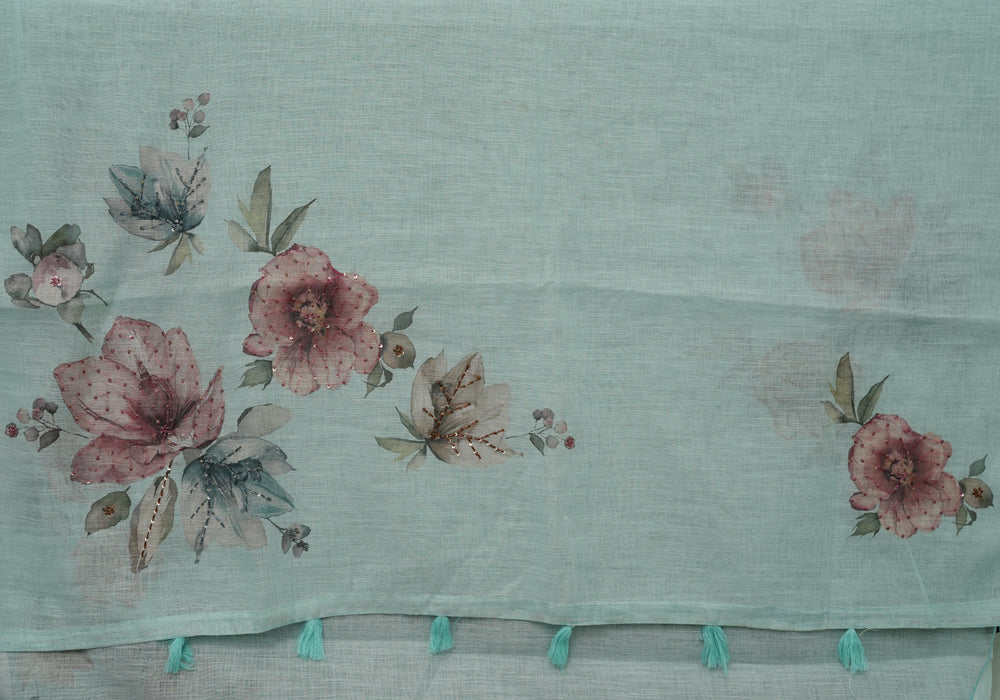 Pastel Green Semi Linen Saree with Digital Print and Sequence Work is OUT OF STOCK currently and available on pre-payment only. Order now for delivery within 2 weeks.