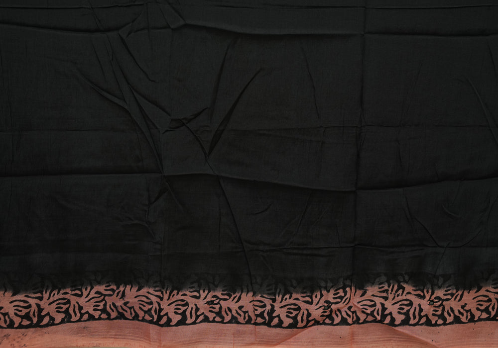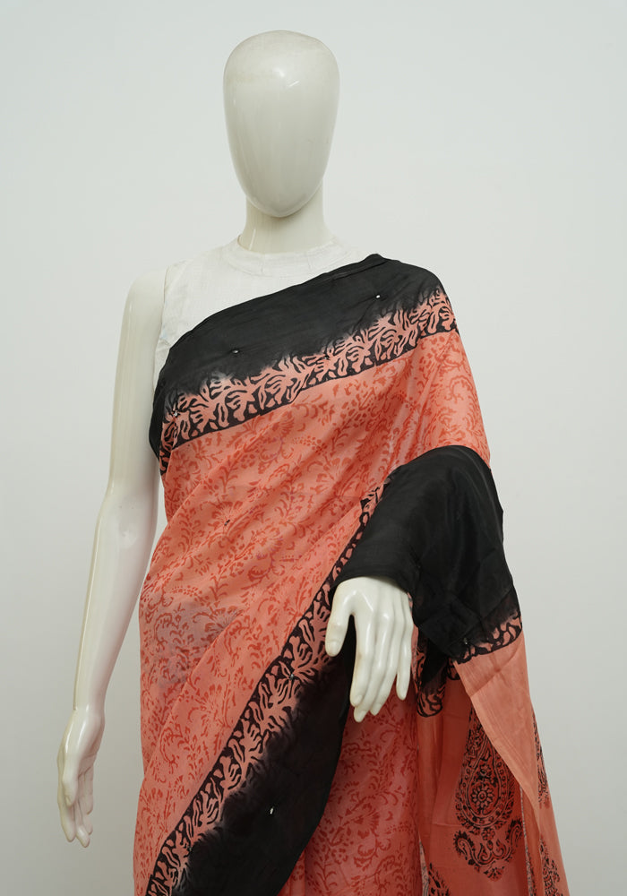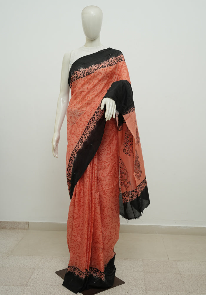 Peach and Black Block Printed Chennur Silk Saree with Mirror Work