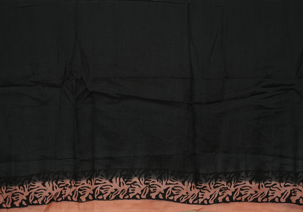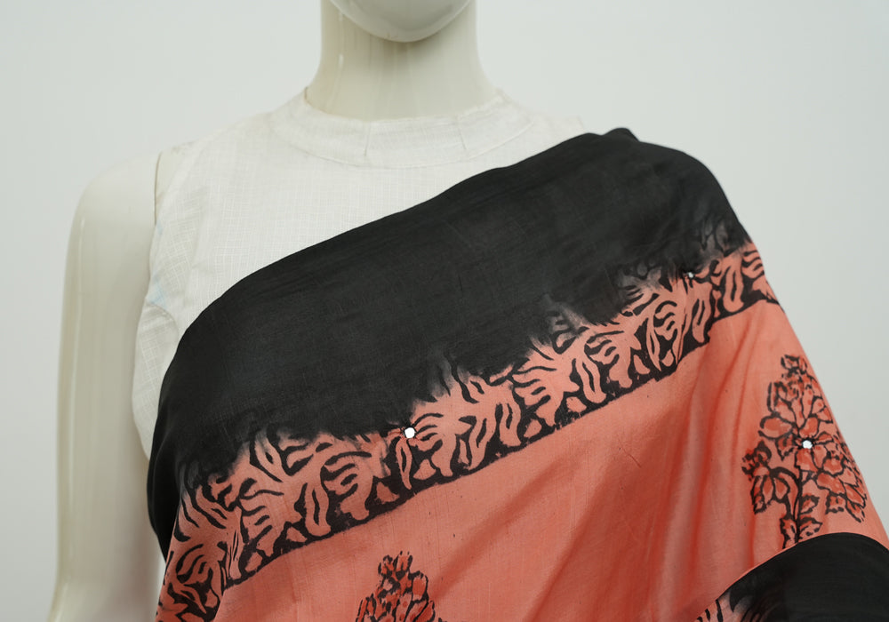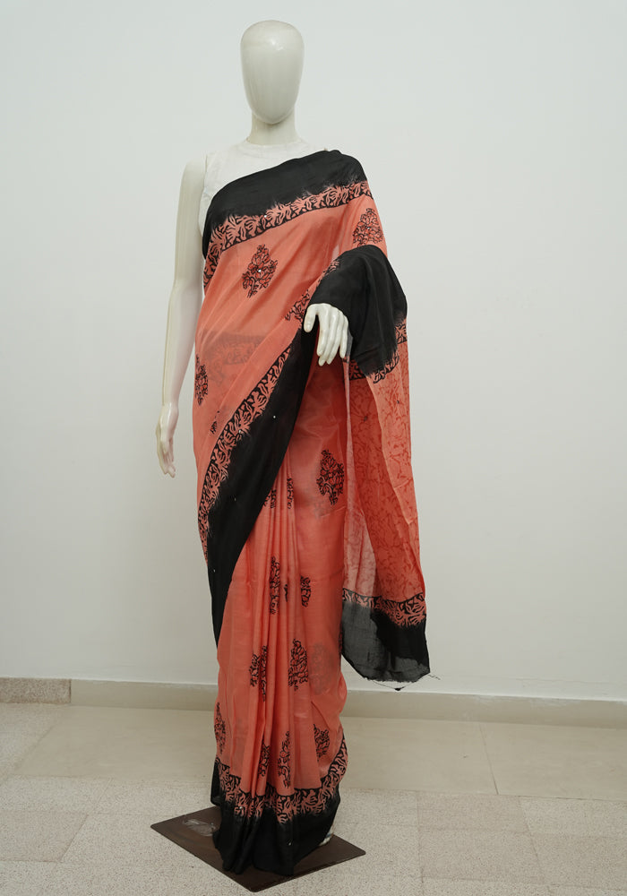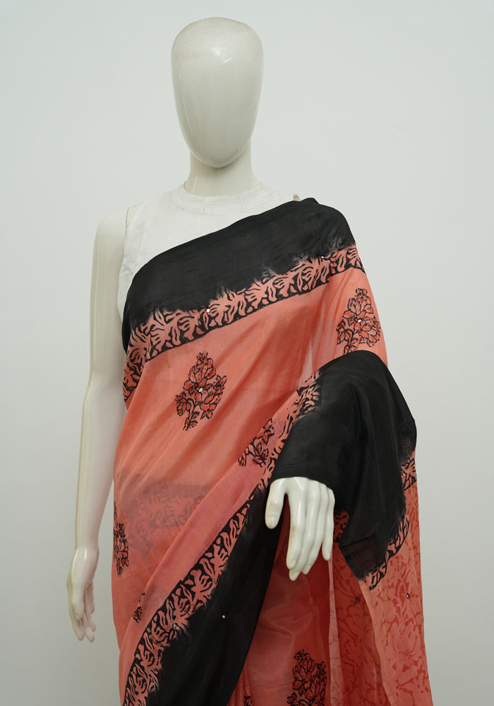 Peach and Black Block Printed Chennur Silk Saree with Mirror Work