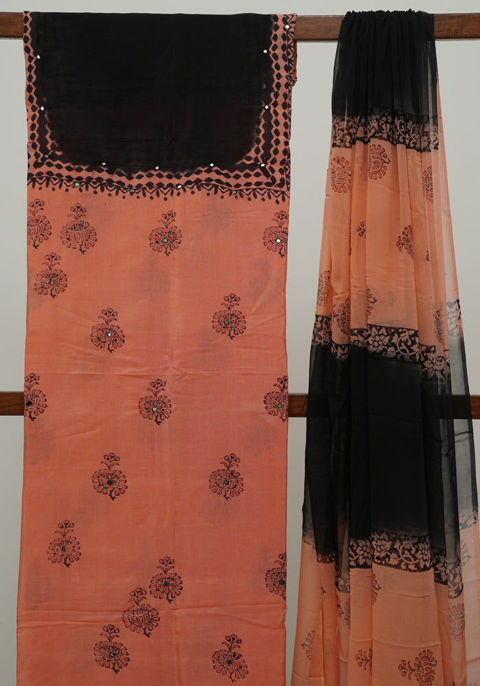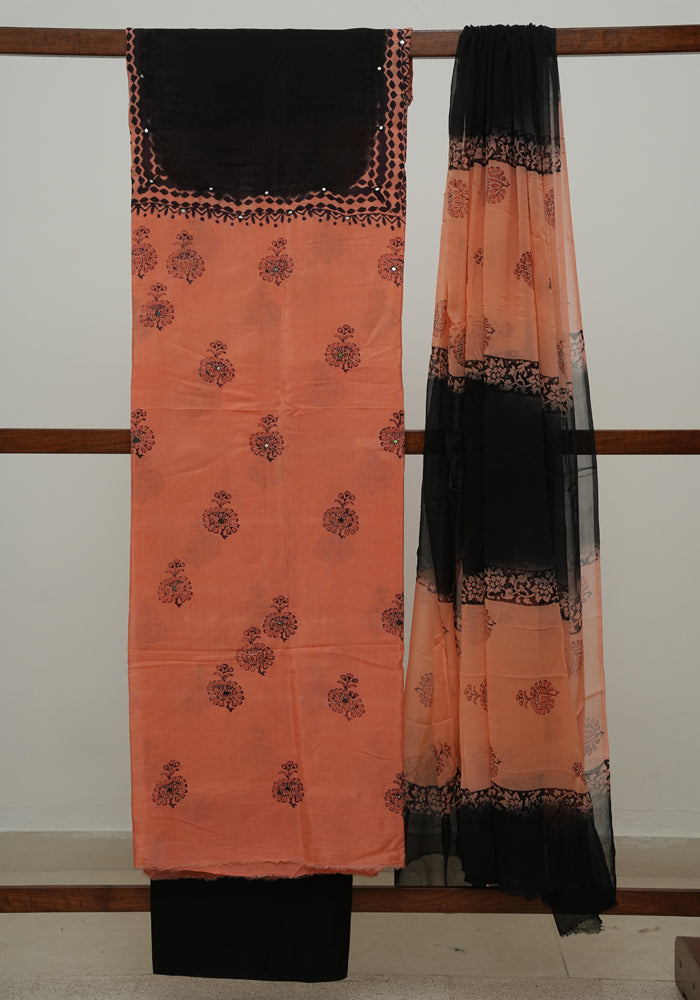 Peach and Black Unstitched Chennur Silk Salwar Set With Mirror Work is OUT OF STOCK currently and available on pre-payment only. Order now for delivery within 2 weeks.