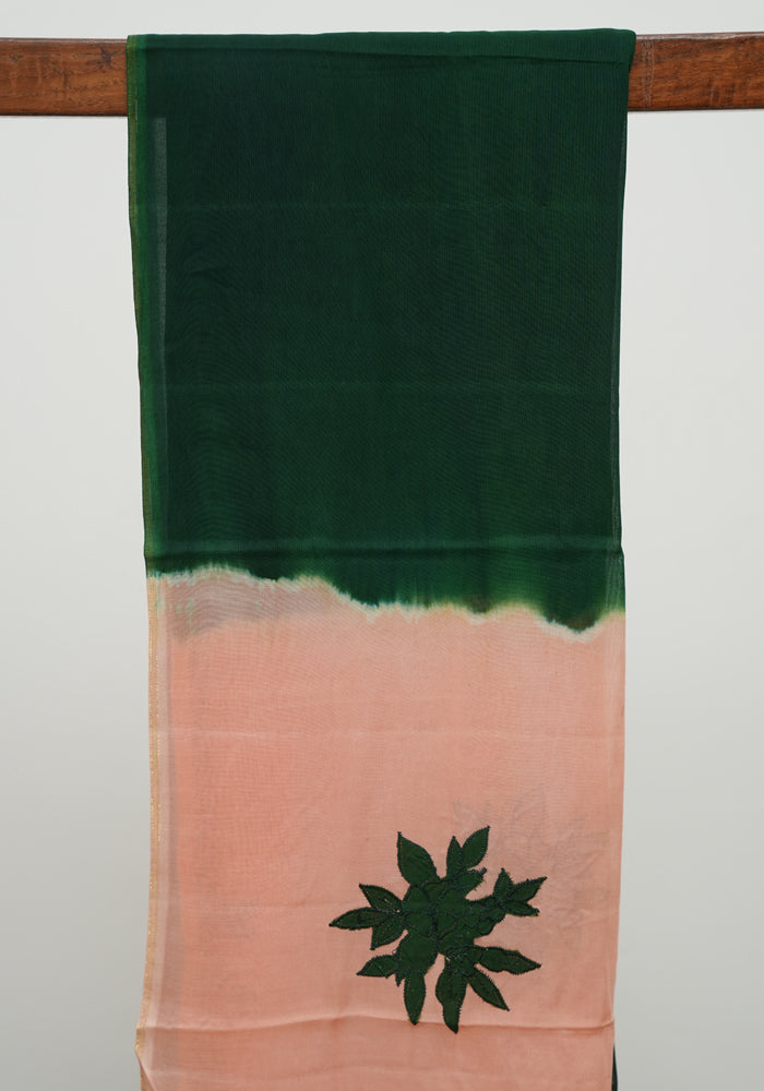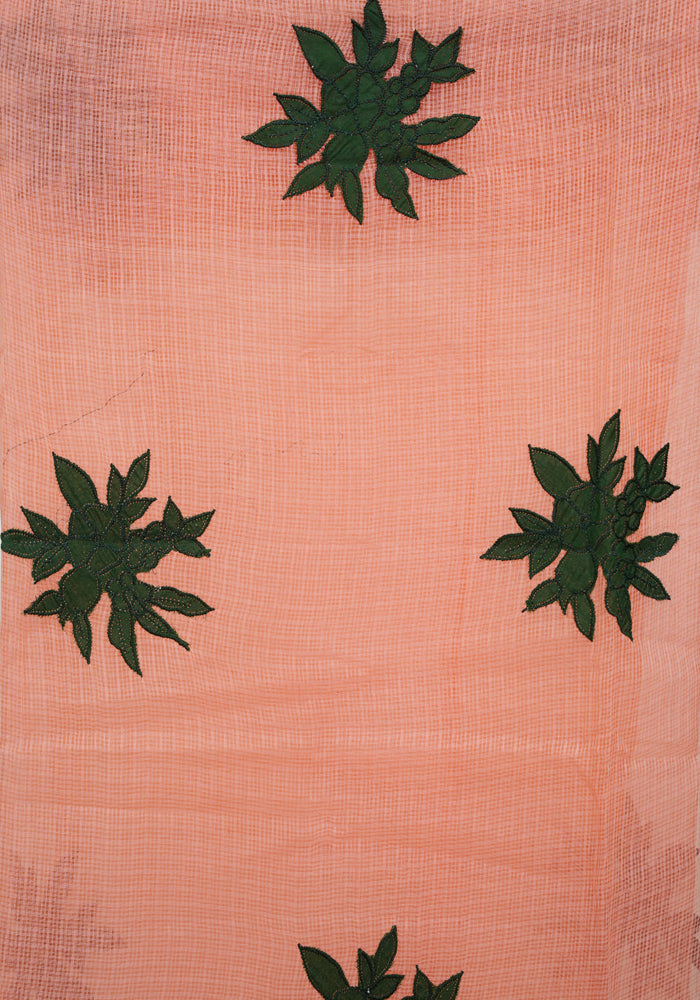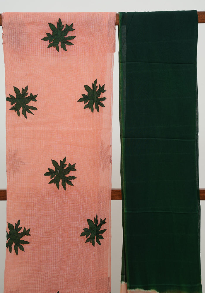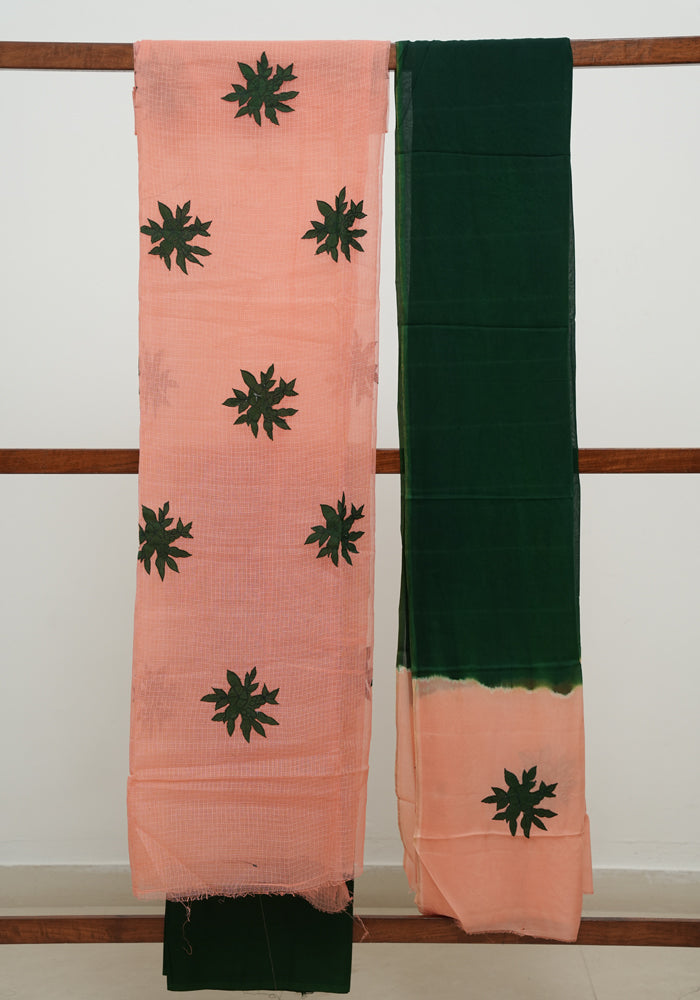 Peach and Dark Green Unstitched Applique Work Kota Salwar Set With Silk Dupatta