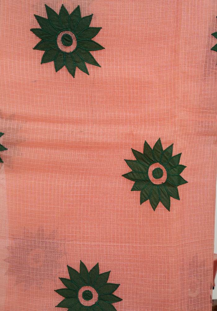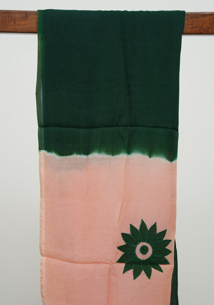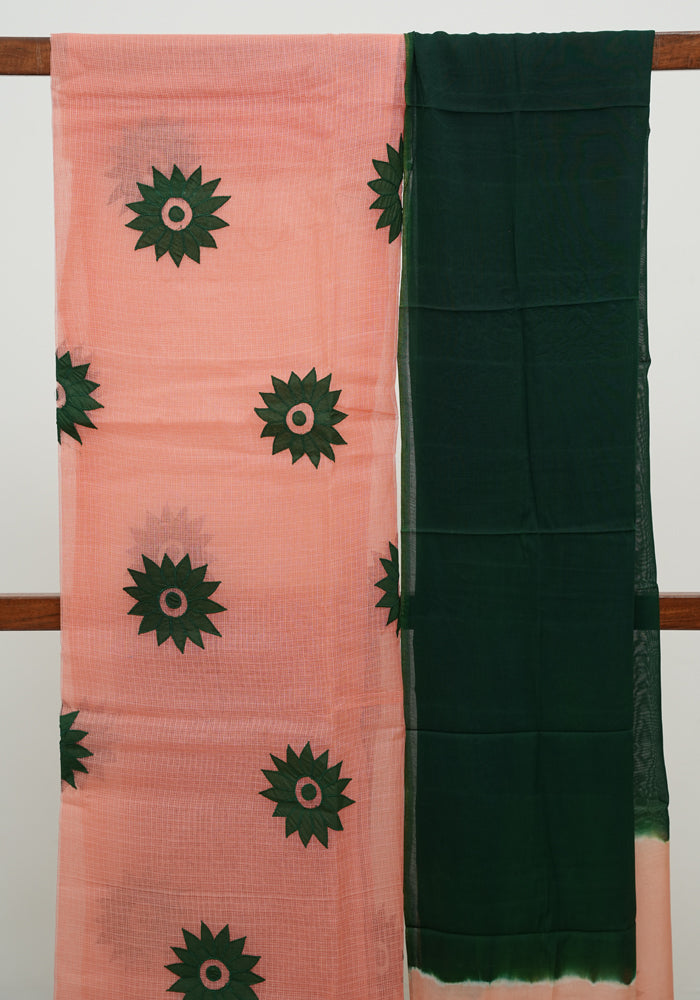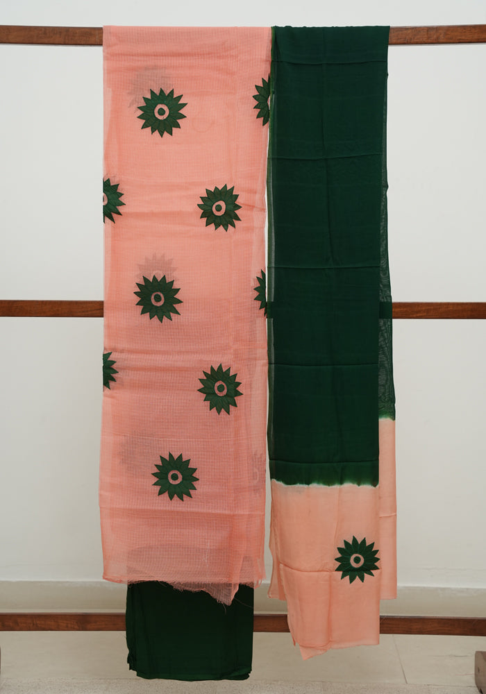 Peach and Dark Green Unstitched Applique Work Kota Salwar Set With Silk Dupatta