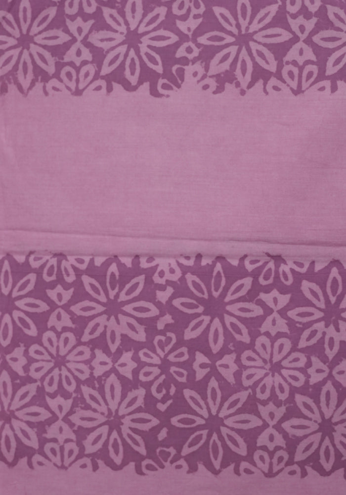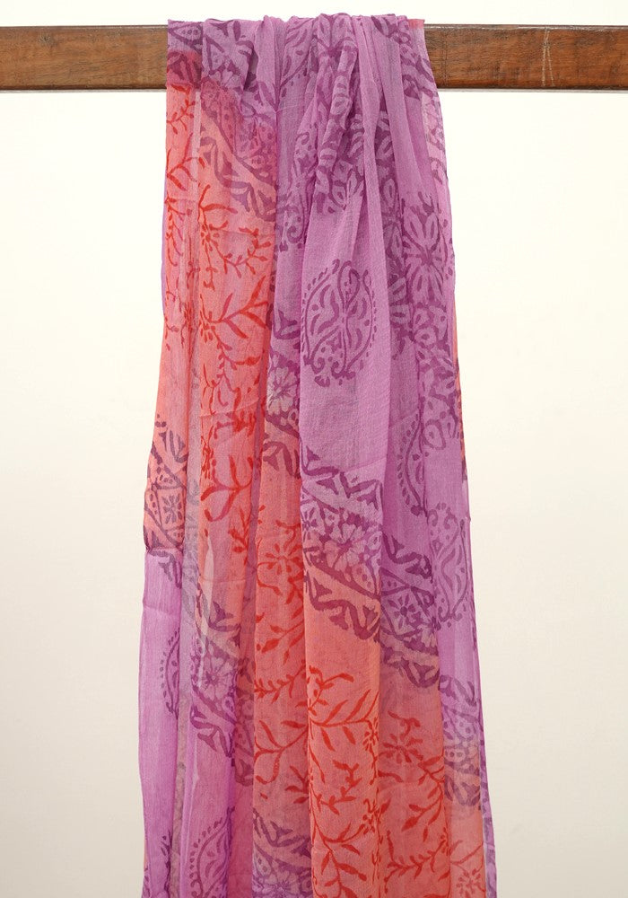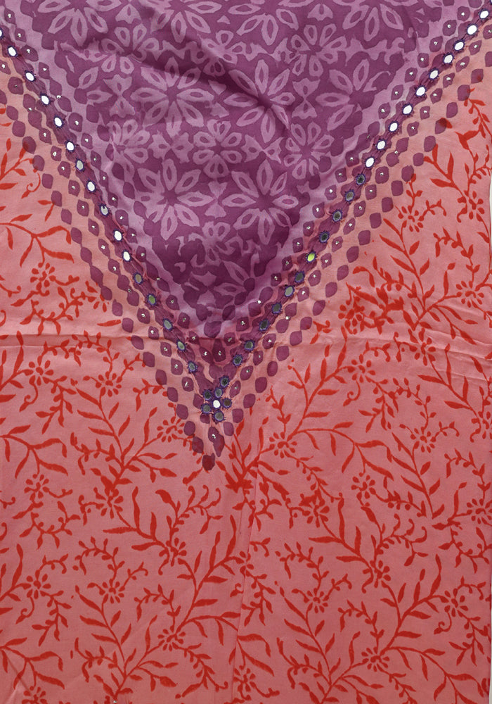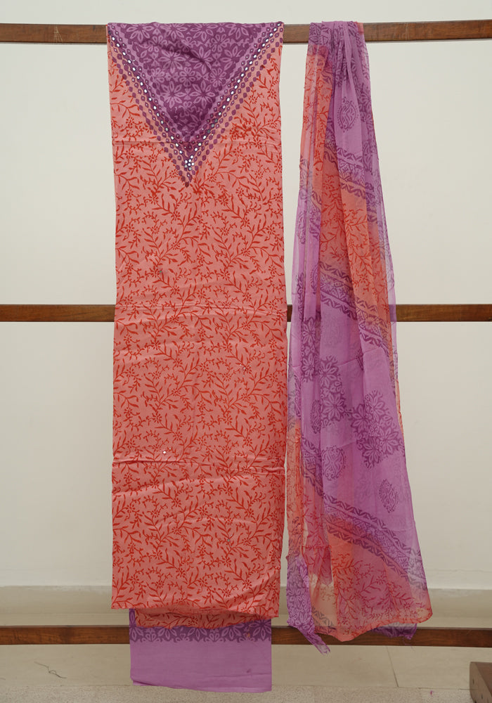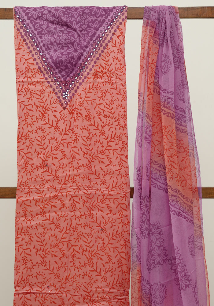 Peach and Purple Modal Silk Block Printed Unstitched Salwar Set With Mirror and Badla Work