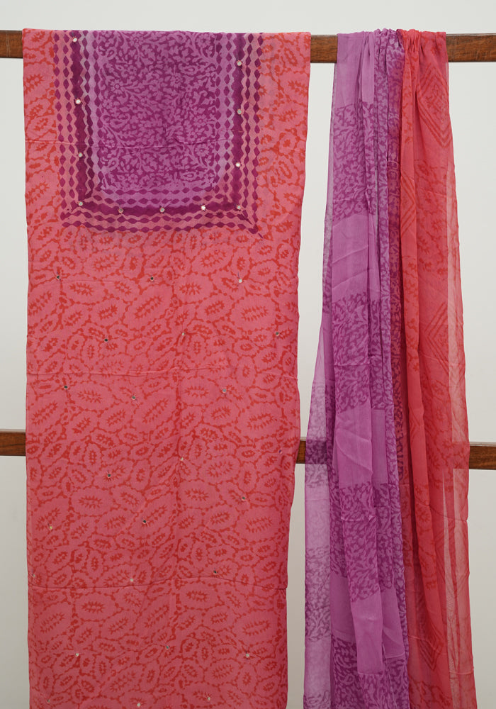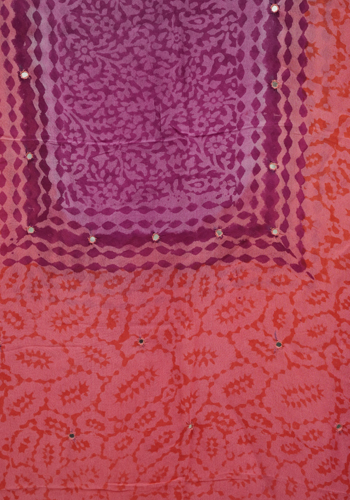 Peach and Purple Unstitched Georgette Salwar Set with Mirror Work is OUT OF STOCK currently and available on pre-payment only. Order now for delivery within 2 weeks.