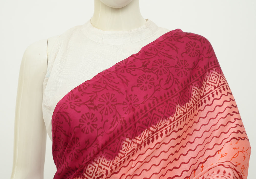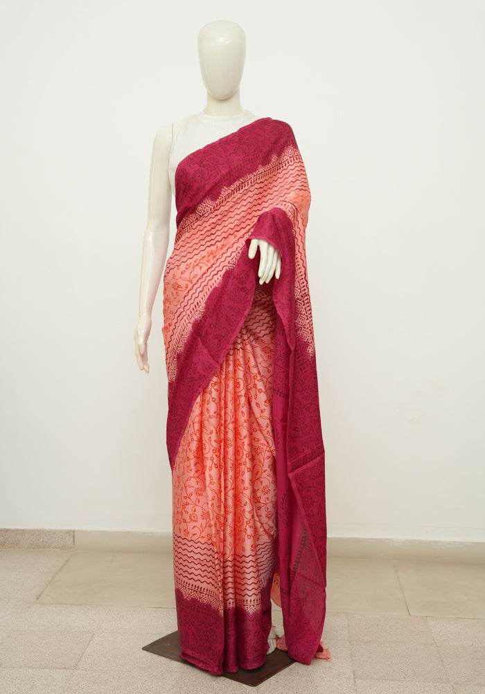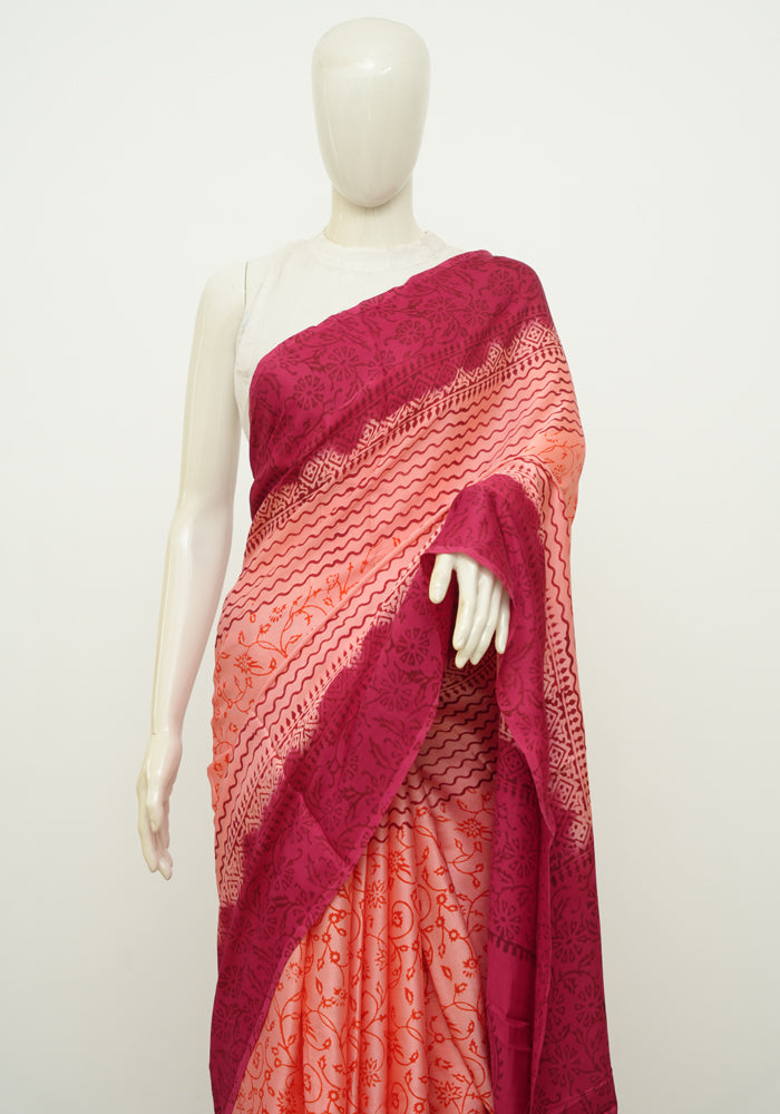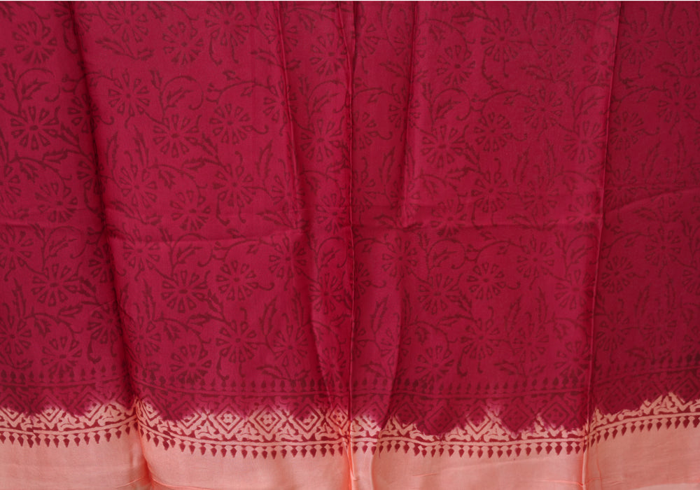 Peach and Red Block Printed Modal Silk saree is OUT OF STOCK currently and available on pre-payment only. Order now for delivery within 2 weeks.