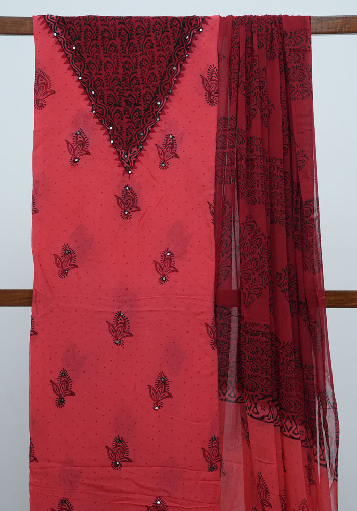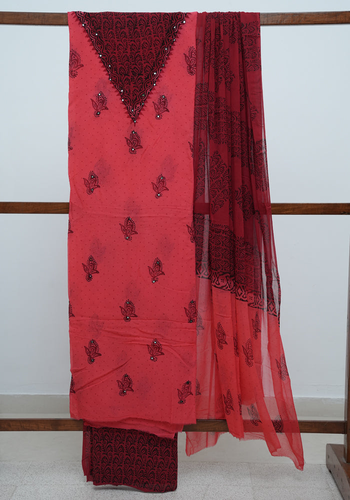Peach and Red Unstitched Georgette Salwar Set with Mirror Work