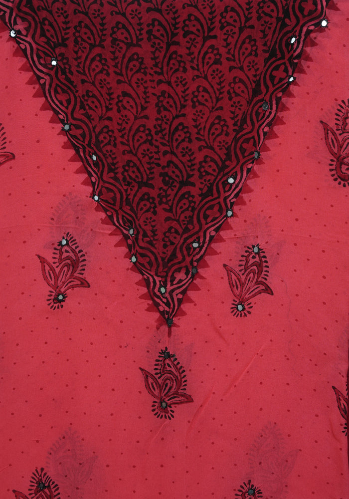 Peach and Red Unstitched Georgette Salwar Set with Mirror Work is OUT OF STOCK currently and available on pre-payment only. Order now for delivery within 2 weeks.
