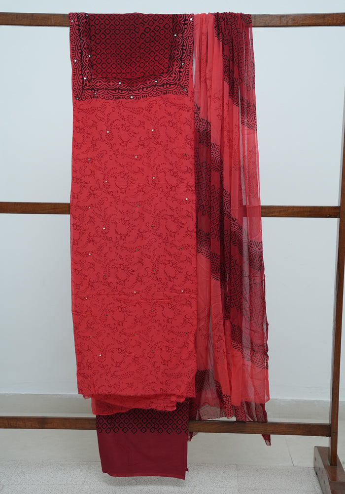 Peach and Red Unstitched Georgette Salwar Set with Mirror Work