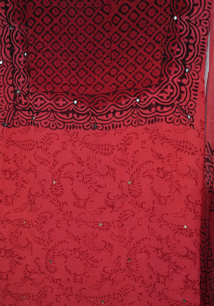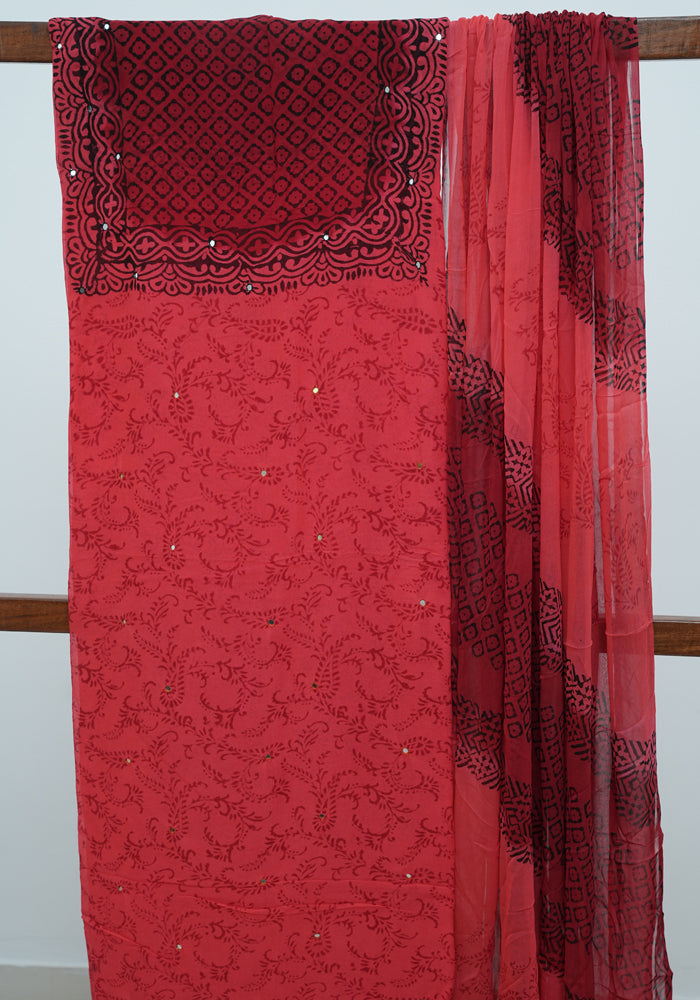 Peach and Red Unstitched Georgette Salwar Set with Mirror Work is OUT OF STOCK currently and available on pre-payment only. Order now for delivery within 2 weeks.