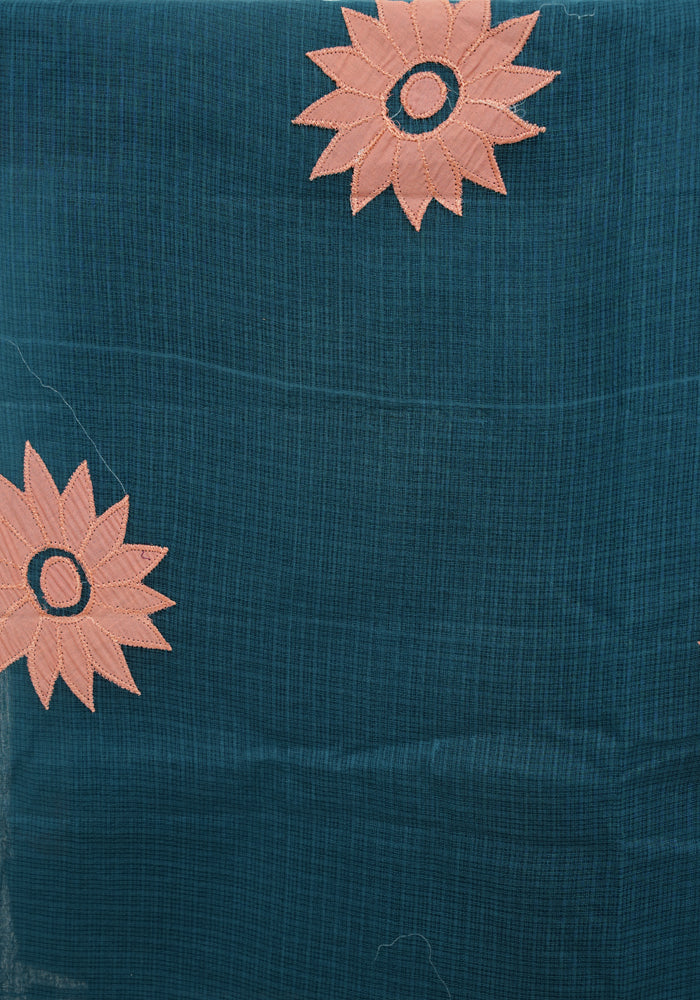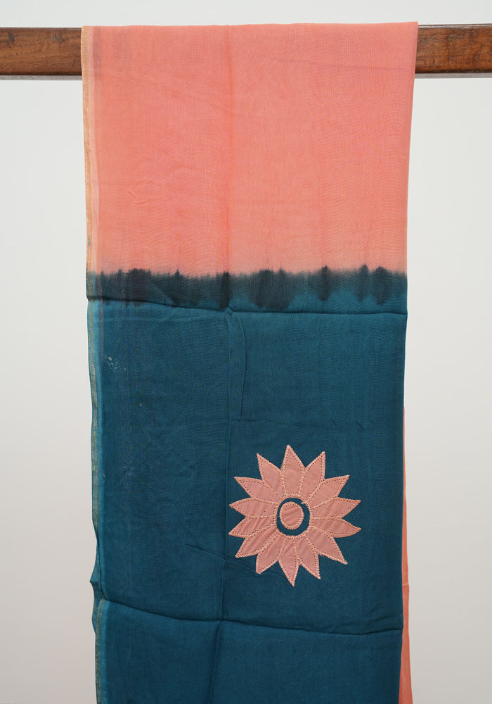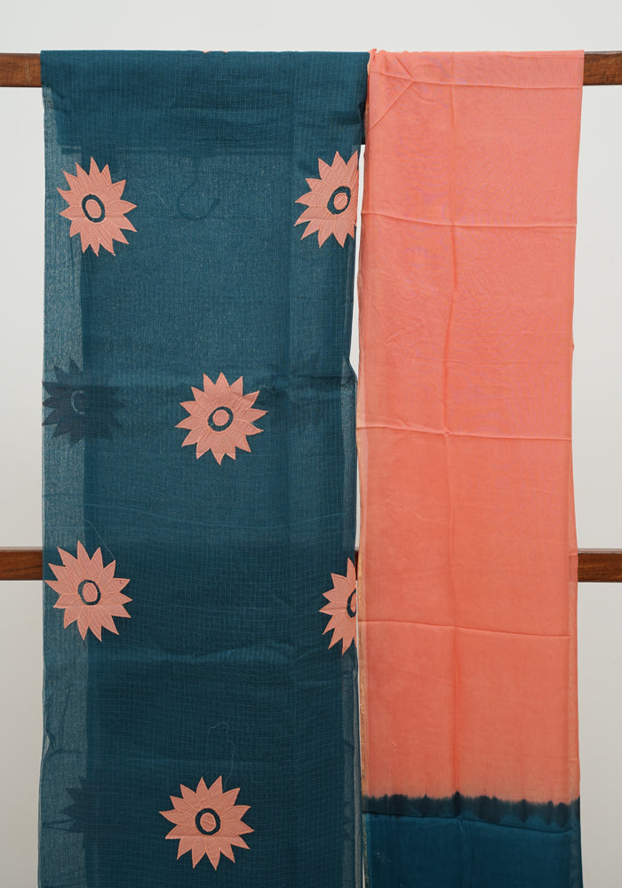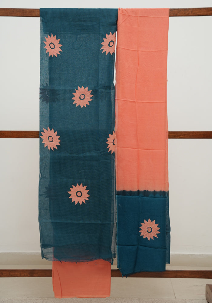 Peacock Blue and Peach Unstitched Applique Work Kota Salwar Set With Silk Dupatta