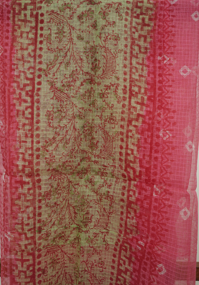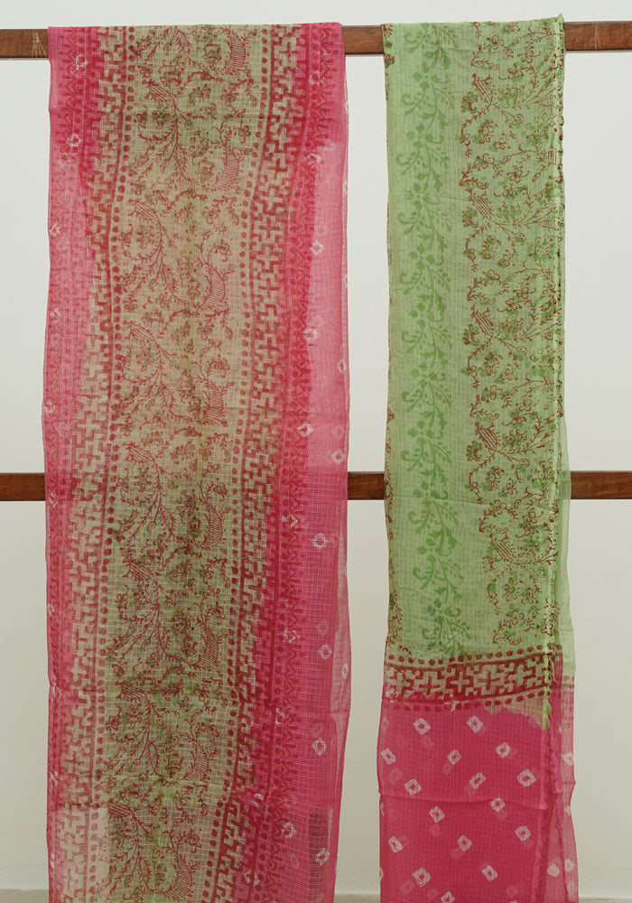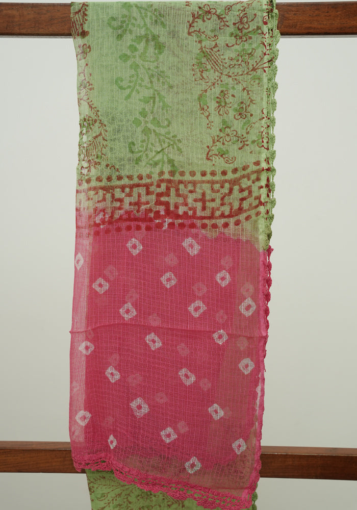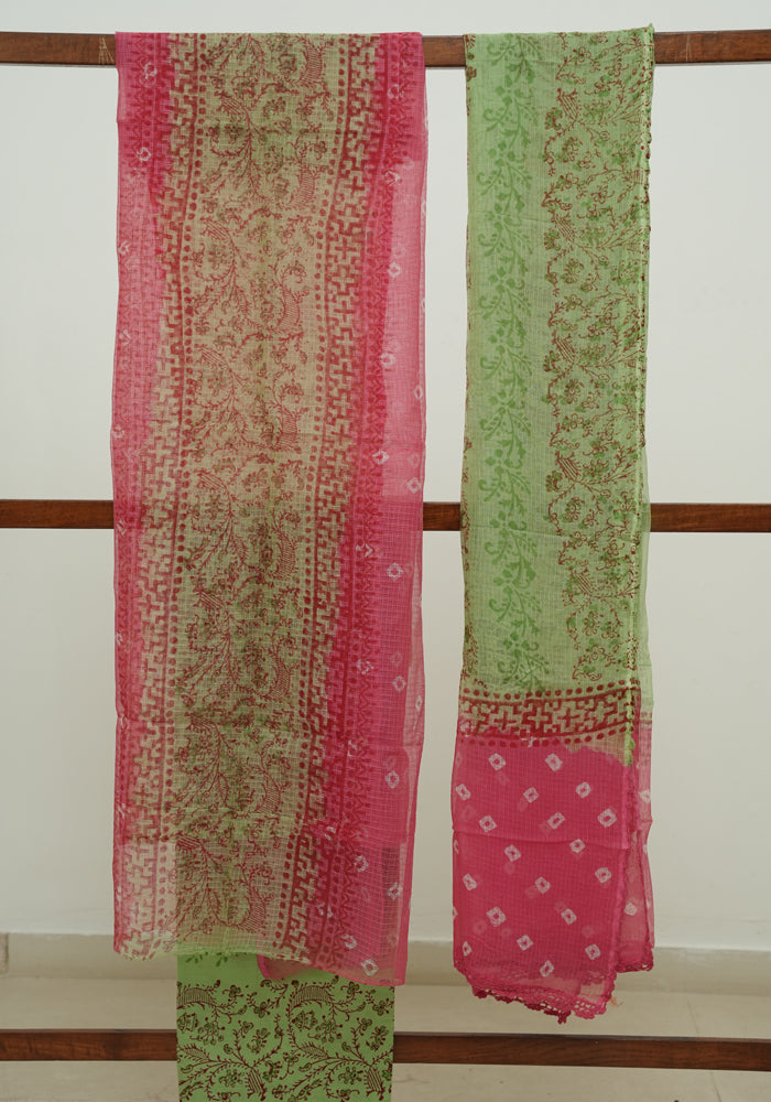 Pink and Green Unstitched Block Printed Kota Salwar Set With Bandini and Crochet Dupatta