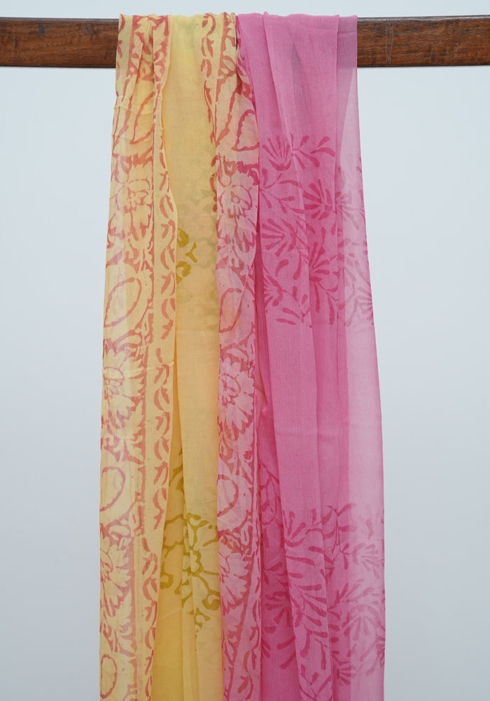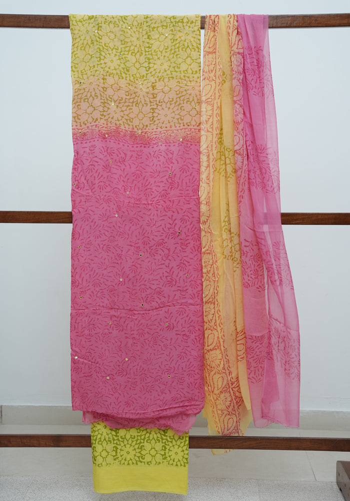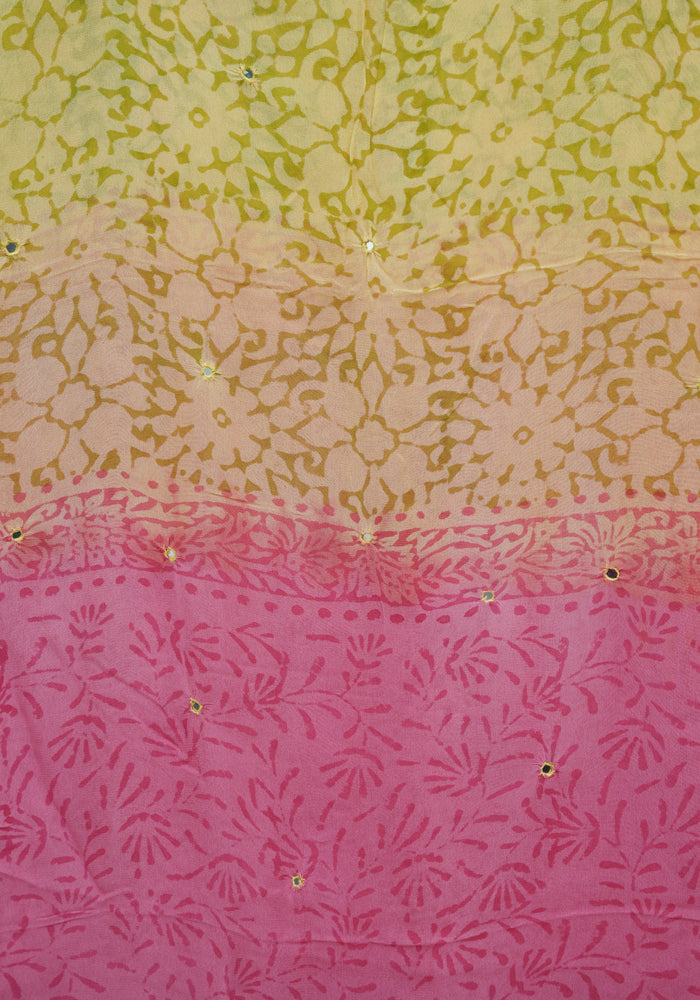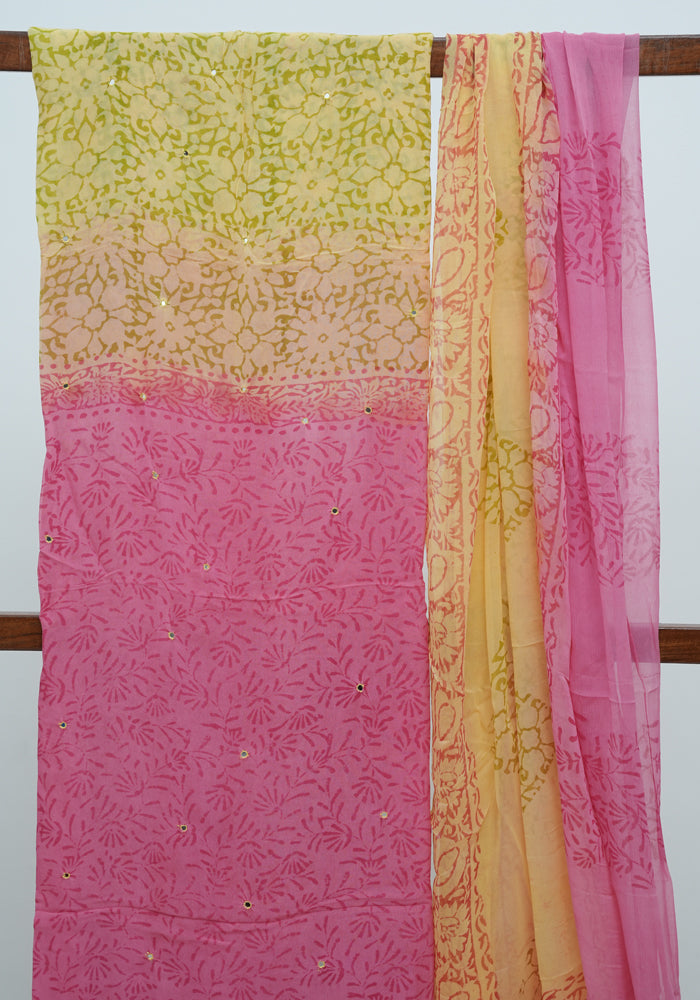 Pink and Lemon Yellow Unstitched Georgette Salwar Set with Mirror Work