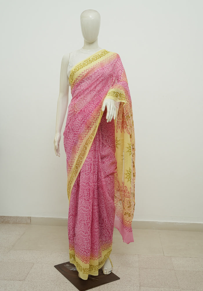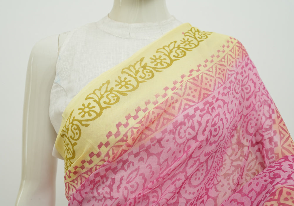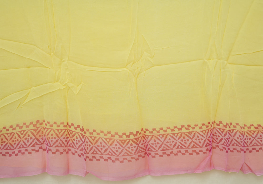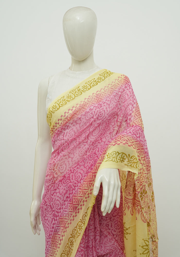 Pink and Yellow Block Printed Georgette Saree