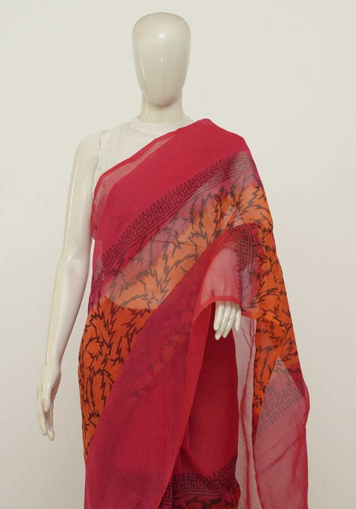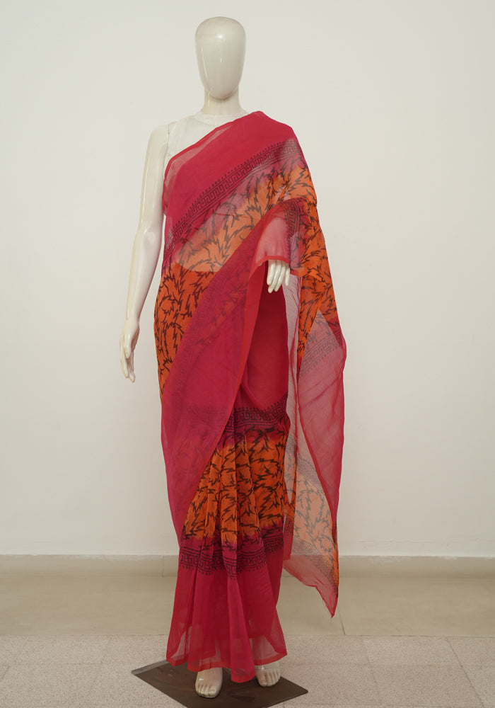 Pinkish Red and Orange Block printed Supernet Kota Saree