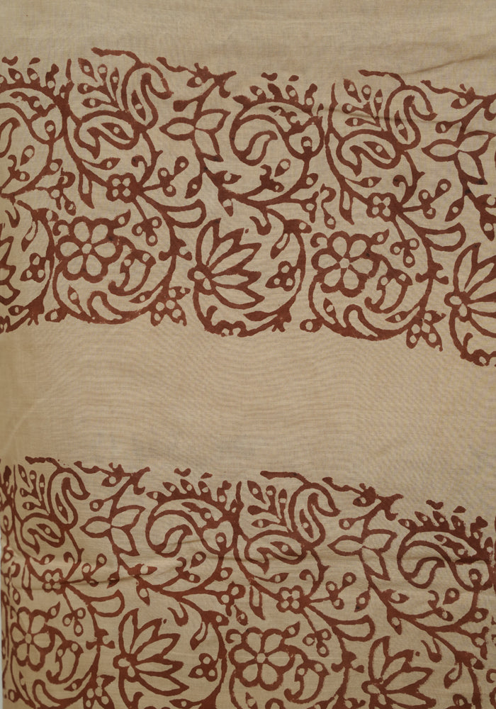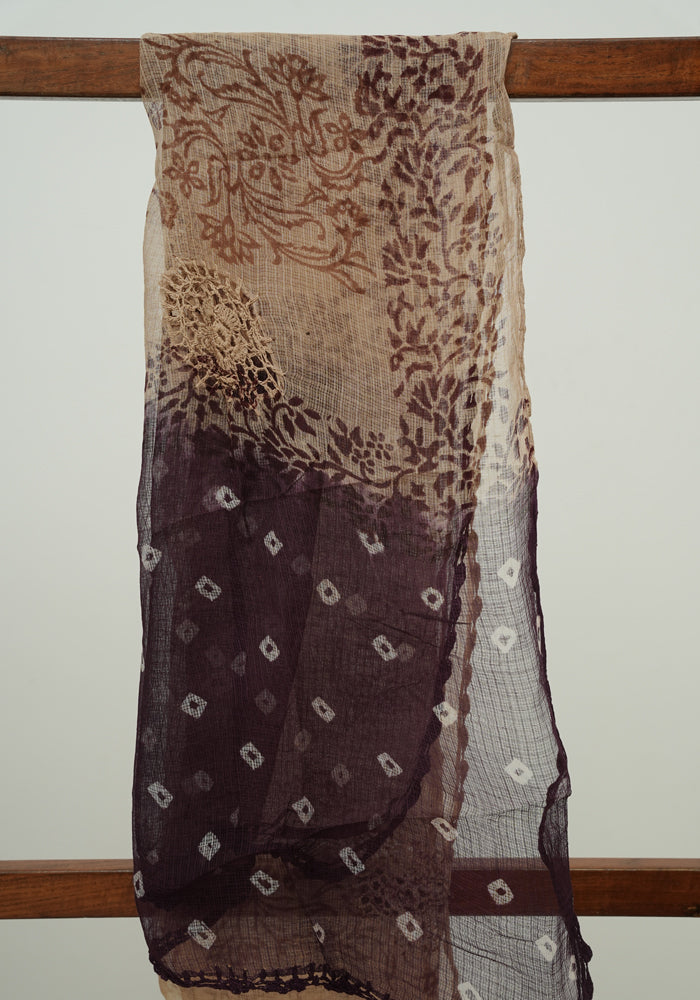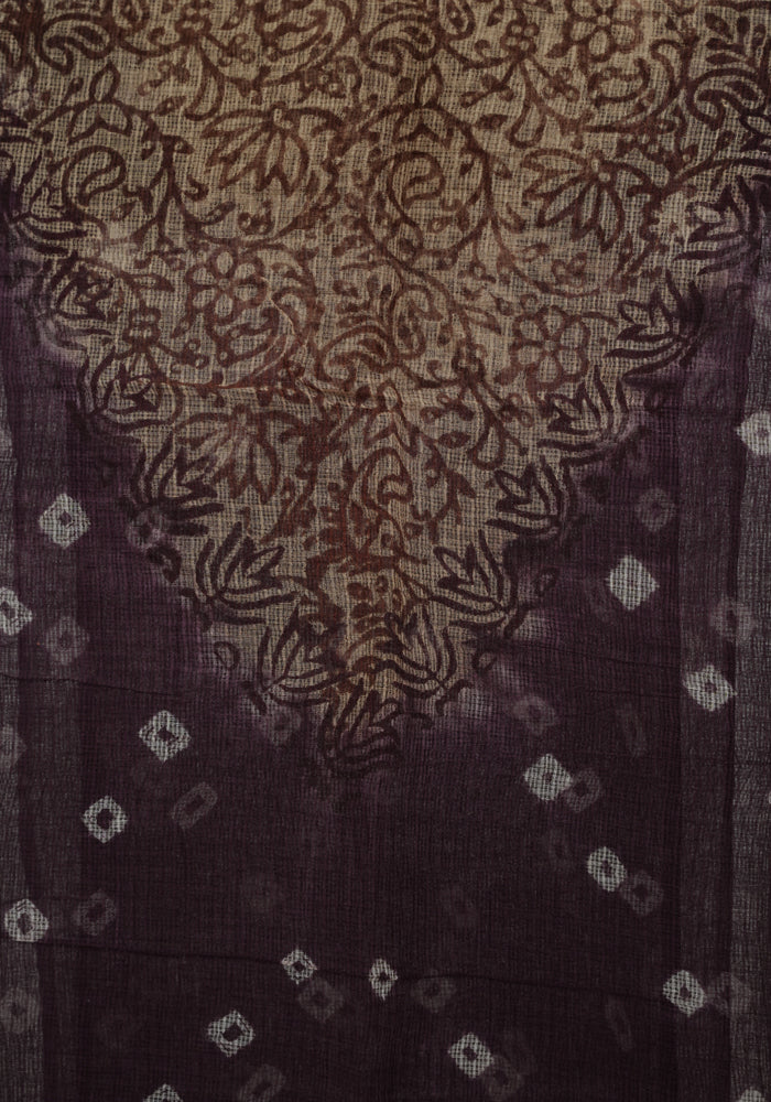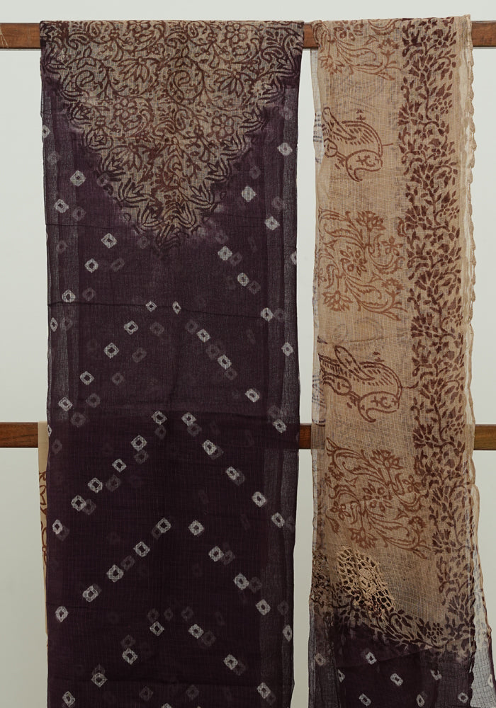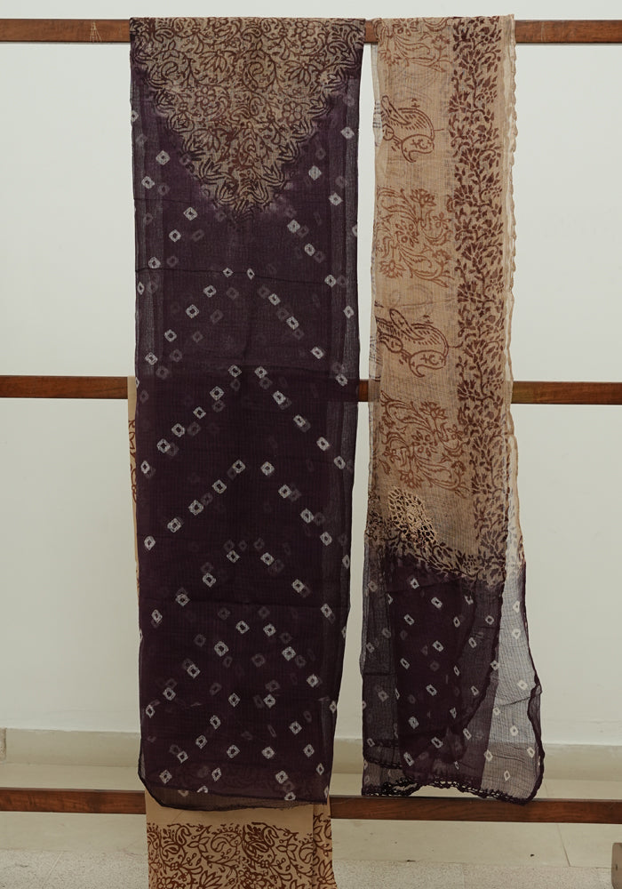 Purple and Light Brown Unstitched Block Printed Kota Salwar Set With Bandini and Crochet Dupatta