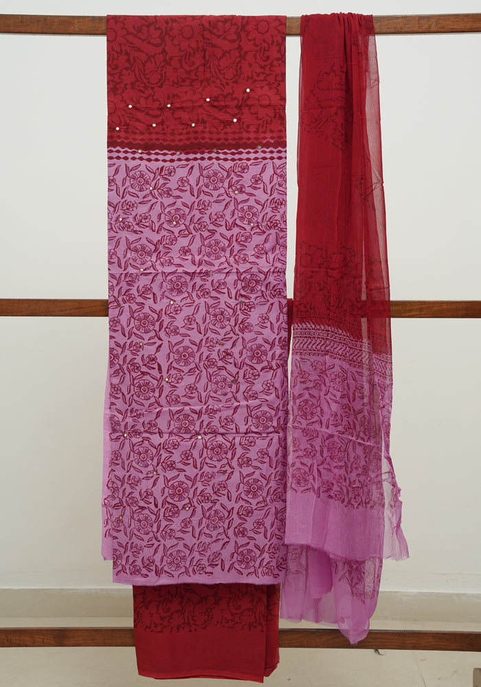 Purple and Red Unstitched Cotton Salwar Set With Mirror Work is OUT OF STOCK currently and available on pre-payment only. Order now for delivery within 2 weeks.
