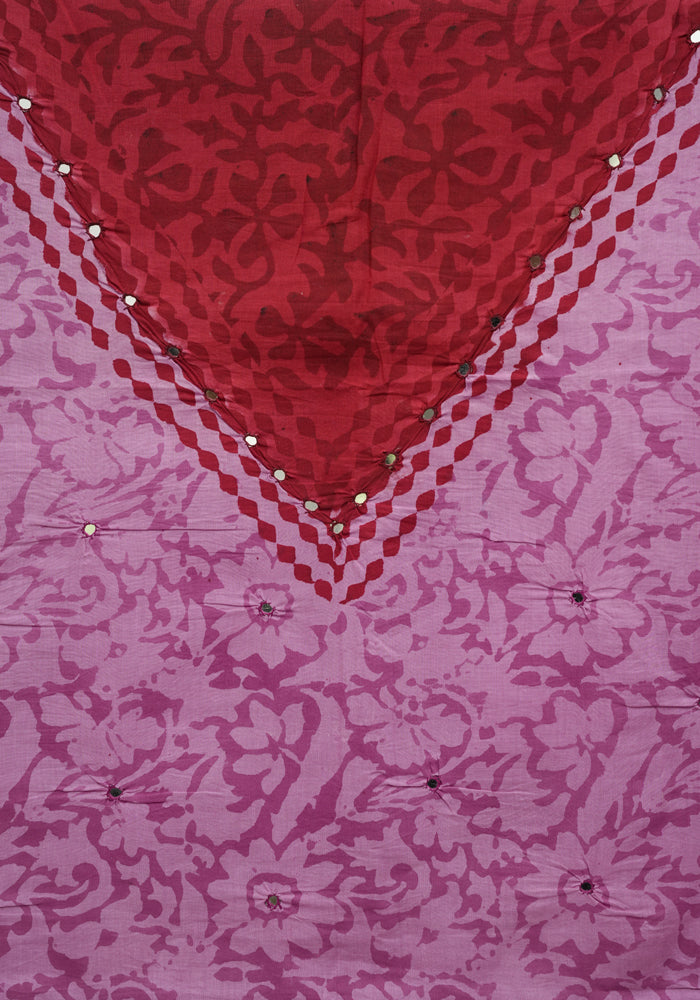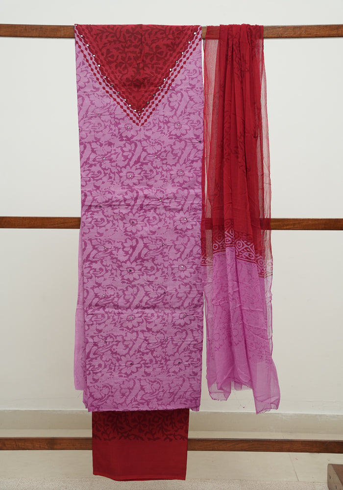 Purple and Red Unstitched Cotton Salwar Set With Mirror Work is OUT OF STOCK currently and available on pre-payment only. Order now for delivery within 2 weeks.