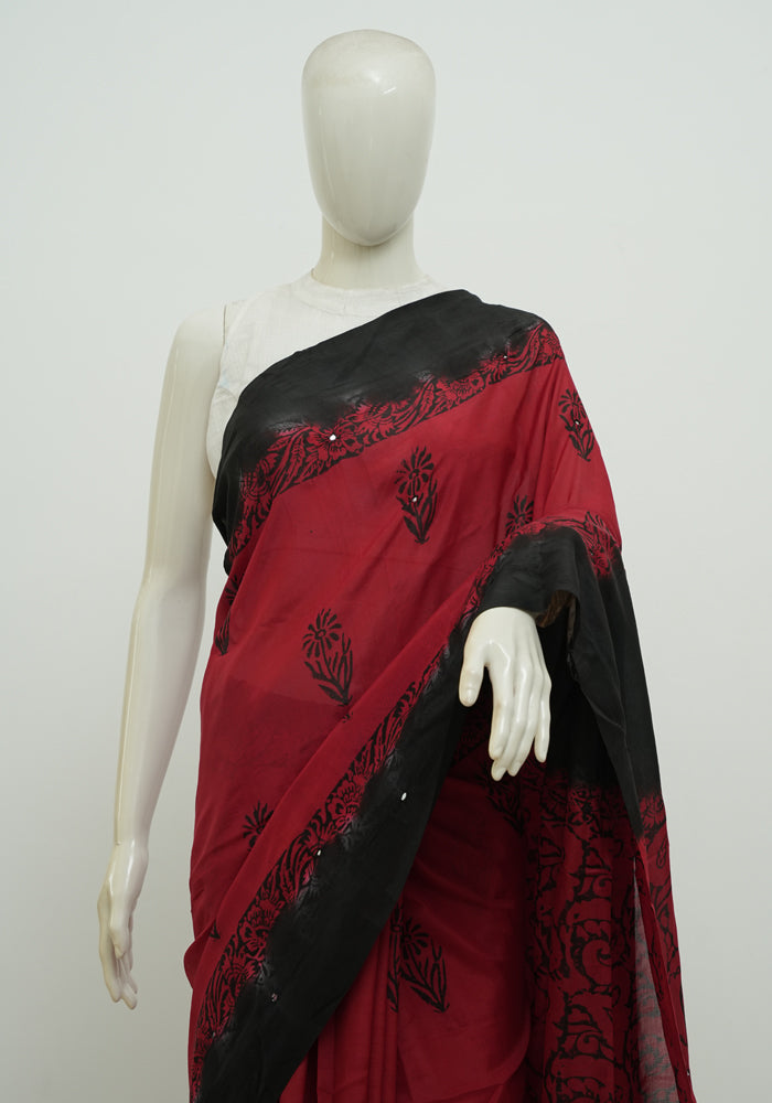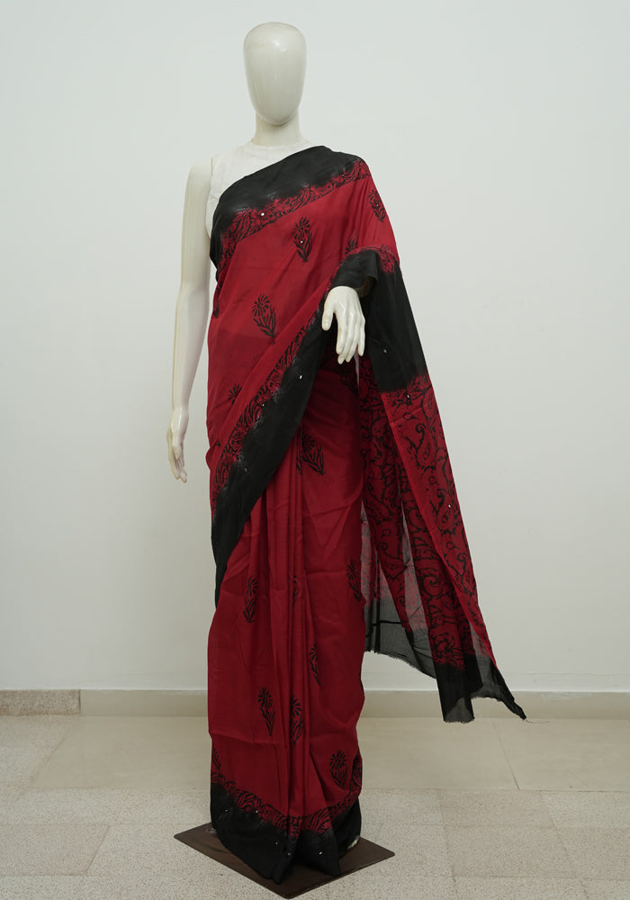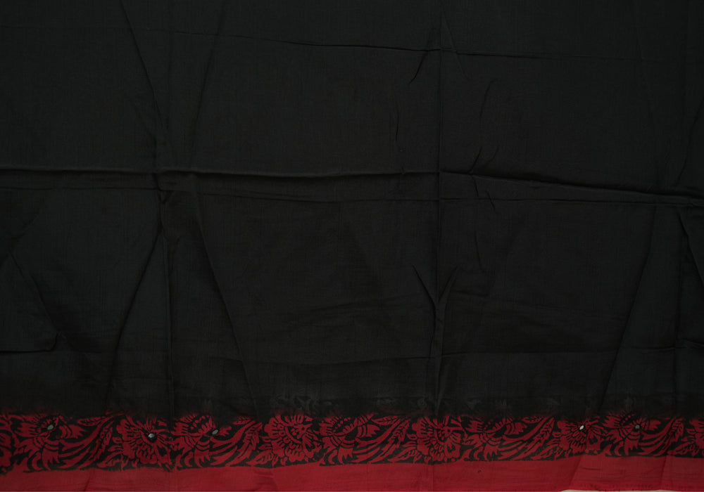 Red and Black Block Printed Chennur Silk Saree with Mirror Work